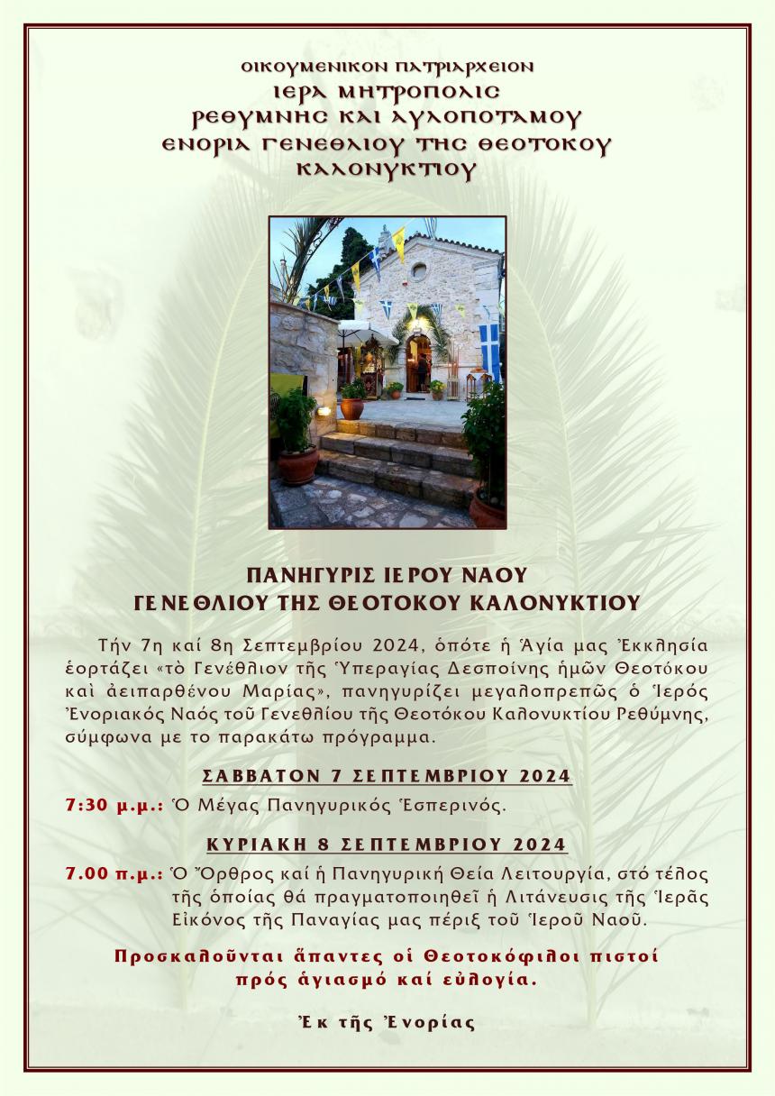 Την 7η και 8η Σεπτεμβρίου 2024, οπότε η Αγία μας Εκκλησία εορτάζει «το Γενέθλιον της Υπεραγίας Δεσποίνης ημών Θεοτόκου και αειπαρθένου Μαρίας», πανηγυρίζει μεγαλοπρεπώς ο Ιερός Ενοριακός Ναός του Γενεθλίου της Θεοτόκου Καλονυκτίου Ρεθύμνης, σύμφωνα με το παρακάτω πρόγραμμα.