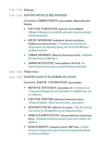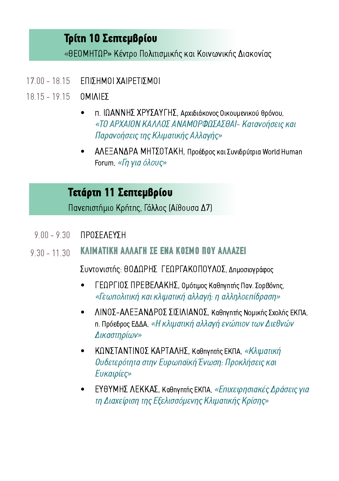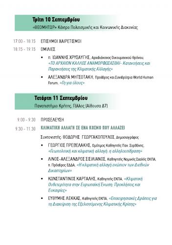 Περιλαμβάνει ομιλίες αξιόλογων προσωπικοτήτων από όλη τη χώρα, οι οποίοι πέραν των διαπιστώσεων, θα προτείνουν δράσεις, προκειμένου η κοινωνία των πολιτών να αφυπνιστεί και να ευαισθητοποιηθεί σχετικά με την κλιματική κρίση και να αναλάβει δράση.