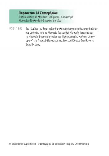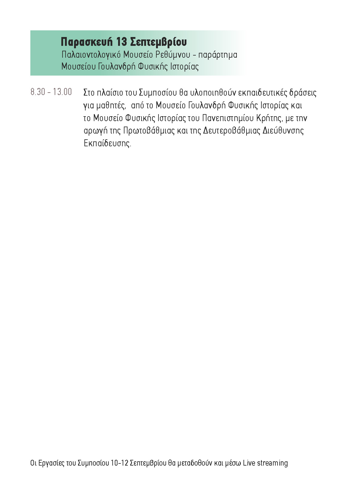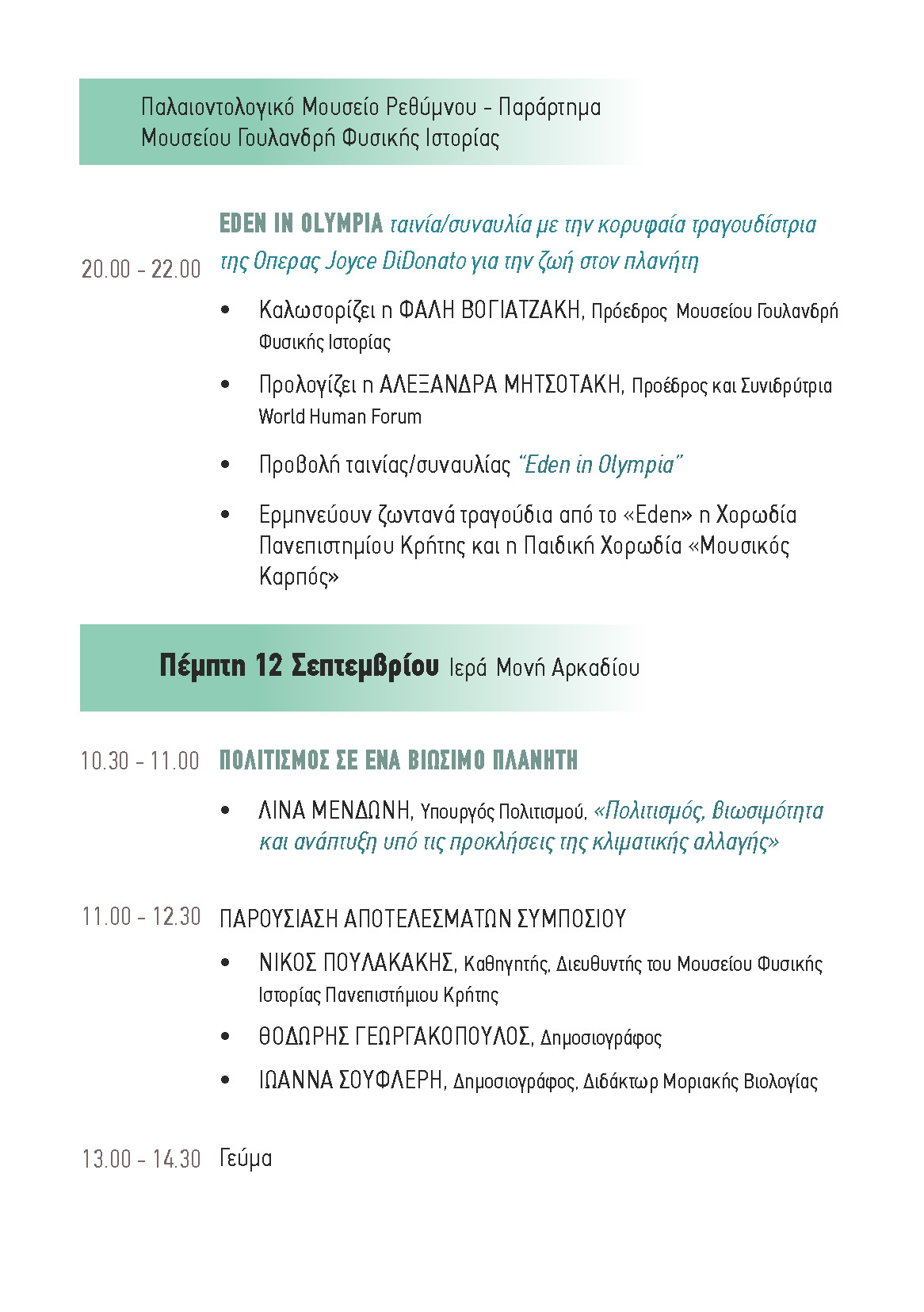 Οι εργασίες του Συμποσίου θα πλαισιωθούν από εκπαιδευτικές δράσεις για μαθητές, του Μουσείο Φυσικής Ιστορίας Κρήτης και του Μουσείο Γουλανδρή Φυσικής Ιστορίας, καθώς και με την προβολή ταινίας με την συναυλία της παγκοσμίου φήμης τραγουδίστριας της όπερας Τζόυς ΝτιΝτονάτο, που έχει διακριθεί για την οικολογική της ευαισθητοποίηση.