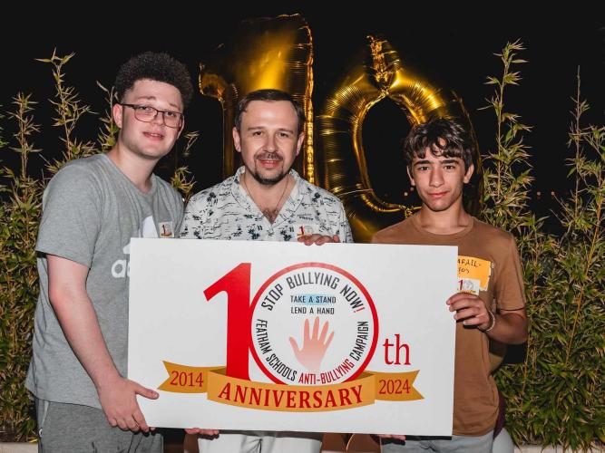 Με αφορμή την 10η επέτειο της πολυβραβευμένης και διεθνώς αναγνωρισμένης Anti-Bullying Εκστρατείας τους τα Κέντρα Αγγλικών «Ασημένια Φήταμ» πραγματοποίησαν πρόσφατα επετειακή βραδιά με την Ομάδα Εθελοντών τους. H Ομάδα, που αποτελείται από μαθητές και απόφοιτους των Κέντρων Φήταμ και συμπεριλαμβάνει πιστοποιημένους Πρεσβευτές Anti-Bullying και κατόχους του Βραβείου Diana, συνάντησε για πρώτη φορά από κοντά το επίτιμο μέλος της από την Αγγλία, τον 17χρονο Αγγλοκύπριο ακτιβιστή Nicholas Nikoforou.