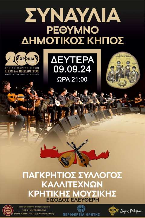Στο πλαίσιο των επετειακών εκδηλώσεων για τη συμπλήρωση 200 ετών από το μαρτύριο των εν Ρεθύμνη Αγίων Τεσσάρων Νεομαρτύρων, Μανουήλ, Αγγελή, Γεωργίου και Νικολάου, πραγματοποιήθηκε το βράδυ της Δευτέρας, 9ης Σεπτεμβρίου 2024, στο Δημοτικό Κήπο Ρεθύμνου, Συναυλία του Παγκρητίου Συλλόγου Καλλιτεχνών Κρητικής Μουσικής, υπό την αιγίδα της Ιεράς Μητροπόλεως Ρεθύμνης και Αυλοποτάμου και με τη στήριξη της Περιφέρειας Κρήτης και του Δήμου Ρεθύμνης.