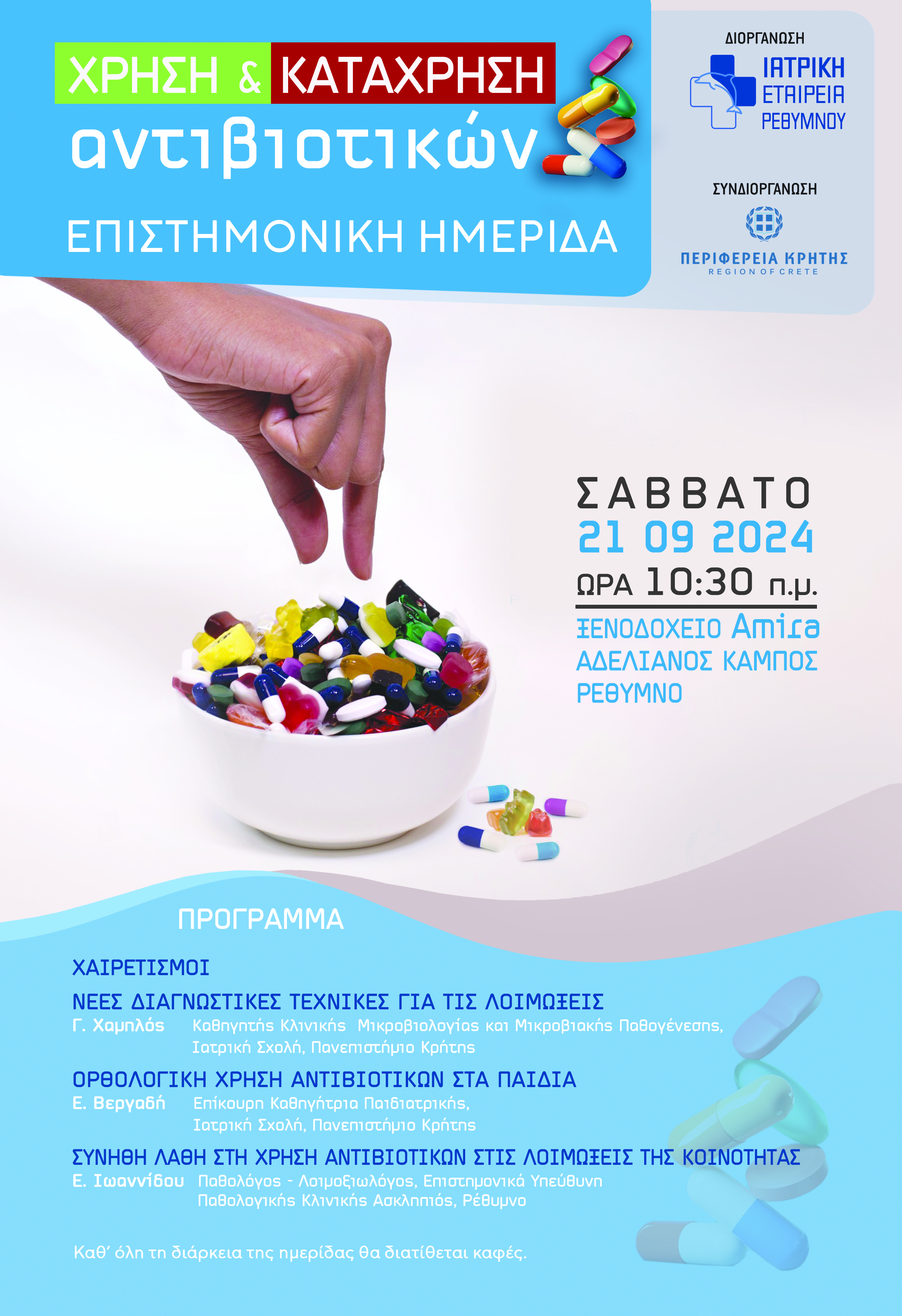 Σκοπός της ημερίδας είναι η ενημέρωση και ευαισθητοποίηση των ιατρών σχετικά με τη σωστή χρήση των αντιβιοτικών και τις συνέπειες της κατάχρησής τους. Θα συζητηθούν θέματα όπως: