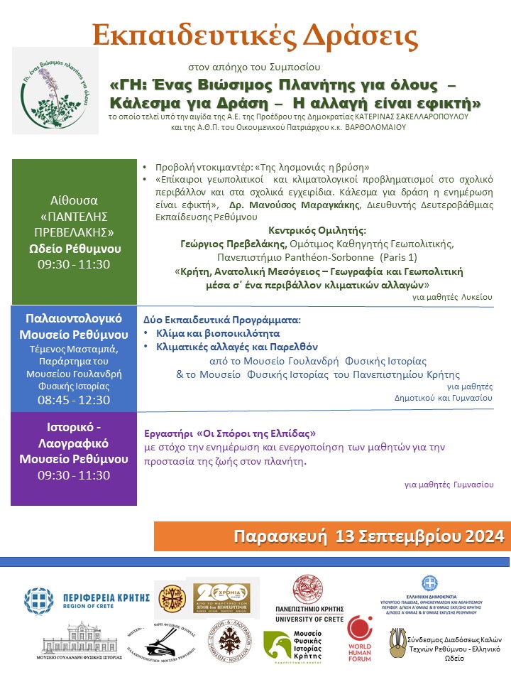 Η Διεύθυνση Δευτεροβάθμιας Εκπαίδευσης Ρεθύμνου συνδιοργάνωσε Παράλληλες Εκπαιδευτικές Δράσεις για μαθητές & μαθήτριες την Παρασκευή 13 Σεπτεμβρίου 2024 στον απόηχο του Συμποσίου «ΓΗ: Ένας Βιώσιμος Πλανήτης για όλους – Κάλεσμα για Δράση – Η αλλαγή είναι εφικτή». Το Οικολογικό Συμπόσιο, το οποίο τελούσε υπό την αιγίδα της Α.Ε. της Προέδρου της Δημοκρατίας ΚΑΤΕΡΙΝΑΣ ΣΑΚΕΛΛΑΡΟΠΟΥΛΟΥ και της Α.Θ.Π. του Οικουμενικού Πατριάρχου κ.κ. ΒΑΡΘΟΛΟΜΑΙΟΥ, συνδιοράνωσαν η Ιερά Μητρόπολις Ρεθύμνης και Αυλοποτάμου, το Πανεπιστήμιο Κρήτης και το Μουσείο Γουλανδρή Φυσικής Ιστορίας στο Ρέθυμνο Κρήτης, στους χώρους της Ιεράς Μητροπόλεως και του Πανεπιστημίου Κρήτης και του Παλαιοντολογικού Μουσείου (παράρτημα ΜΓΦΙ) από τις 10/9/2024 έως τις 12/9/2024