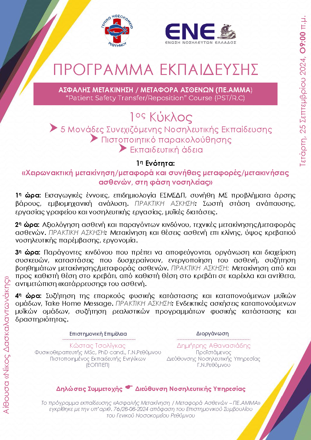 Σε αυτό το πλαίσιο διοργανώνεται από τη Διεύθυνση Νοσηλευτικής Υπηρεσίας του Γ.Ν.Ρεθύμνου, το εκπαιδευτικό πρόγραμμα επιμόρφωσης: