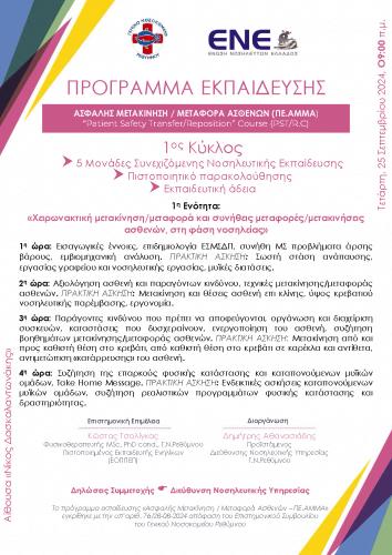 Πρόκειται για ένα 4ωρο πρωτοπόρο, εκπαιδευτικό πρόγραμμα που αφενός σκοπεύει στη κατανόηση, την πρόληψη και τη διαχείριση των παραγόντων κινδύνου που σχετίζονται με την ασφαλή μεταφορά/μετακίνηση του ασθενούς στη φάση νοσηλείας. Αφετέρου, την εργονομία, την τεχνική, τη στρατηγική και τη μείωση της καταπόνησης του επαγγελματία υγείας, που διαχειρίζεται τη μεταφορά/μετακίνηση.
