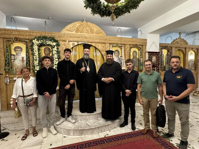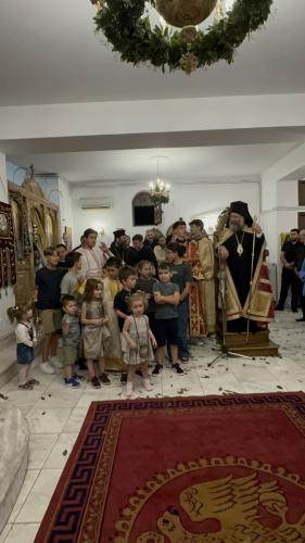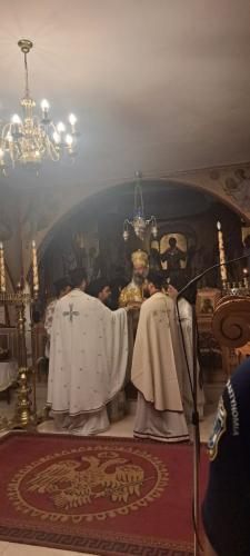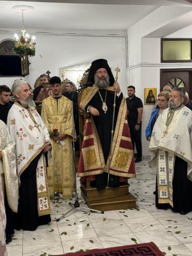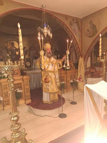 Ακολούθως, ο Σεβασμιώτατος με τη συνοδεία του μετέβησαν στον Ιερό Ναό Κοιμήσεως της Θεοτόκου Καρωτής και παρέστησαν συμπροσευχόμενοι νυκτερινή Θεία Λειτουργία, τελουμένη επί τοις ονομαστηρίοις του Εφημερίου της Ενορίας, Πανοσιολ. Αρχιμ. Ρωμανού Αναστασιάδη.