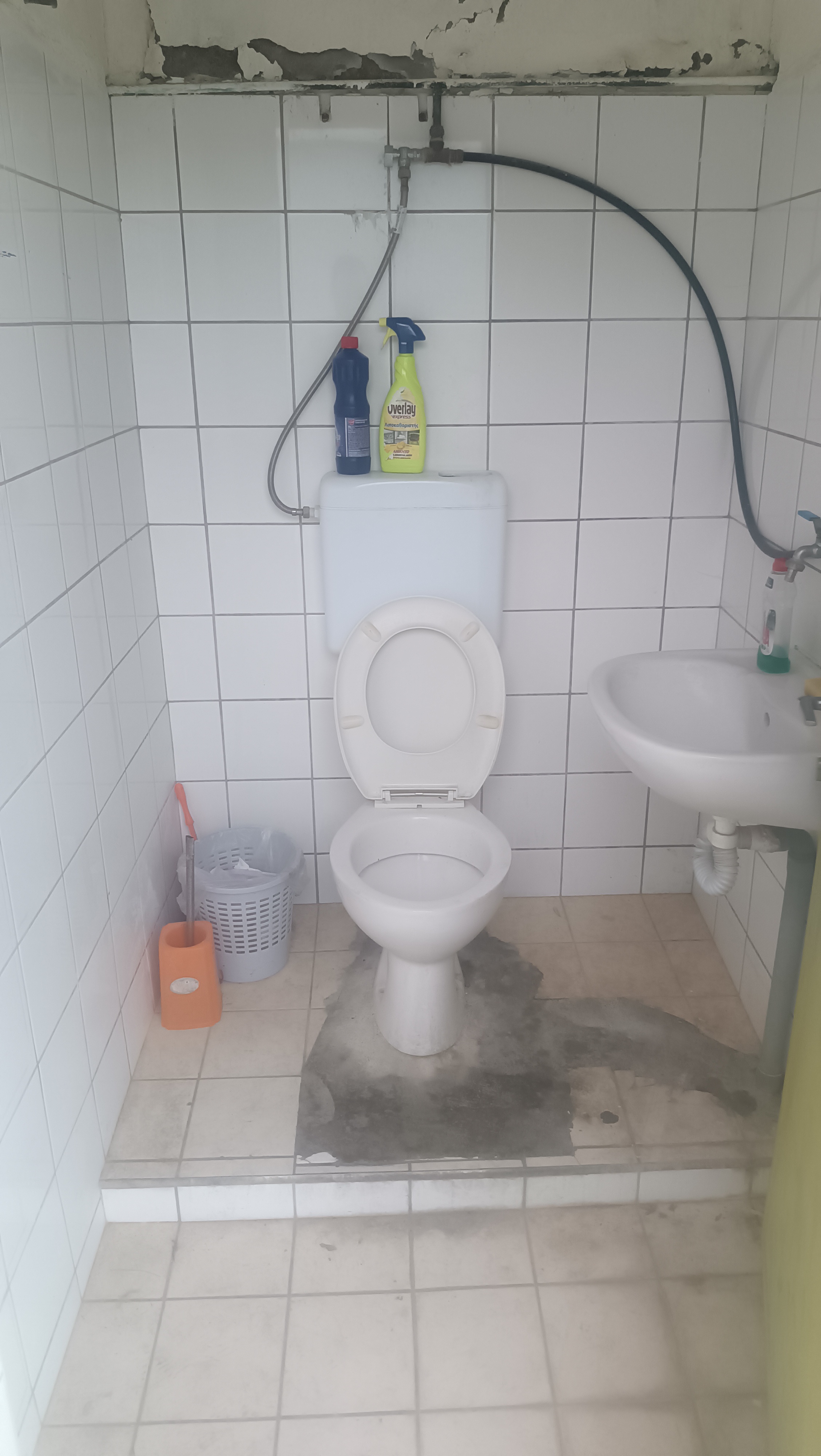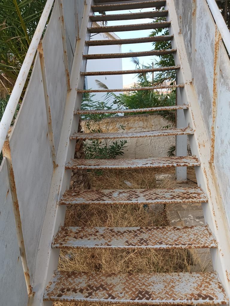 «Σημερινή φωτό πριν λίγο η σιδερένια σκάλα μέσα στις σκουριές,στο κλειστό Μ.Μ που οδηγεί πάνω στο γυμναστήριο. Μάλλον είναι δύσκολο για τον δήμο Ρεθύμνου,να πληρώσει ένα μεροκάματο σε έναν ελαιοχρωματιστή να την βάψει».