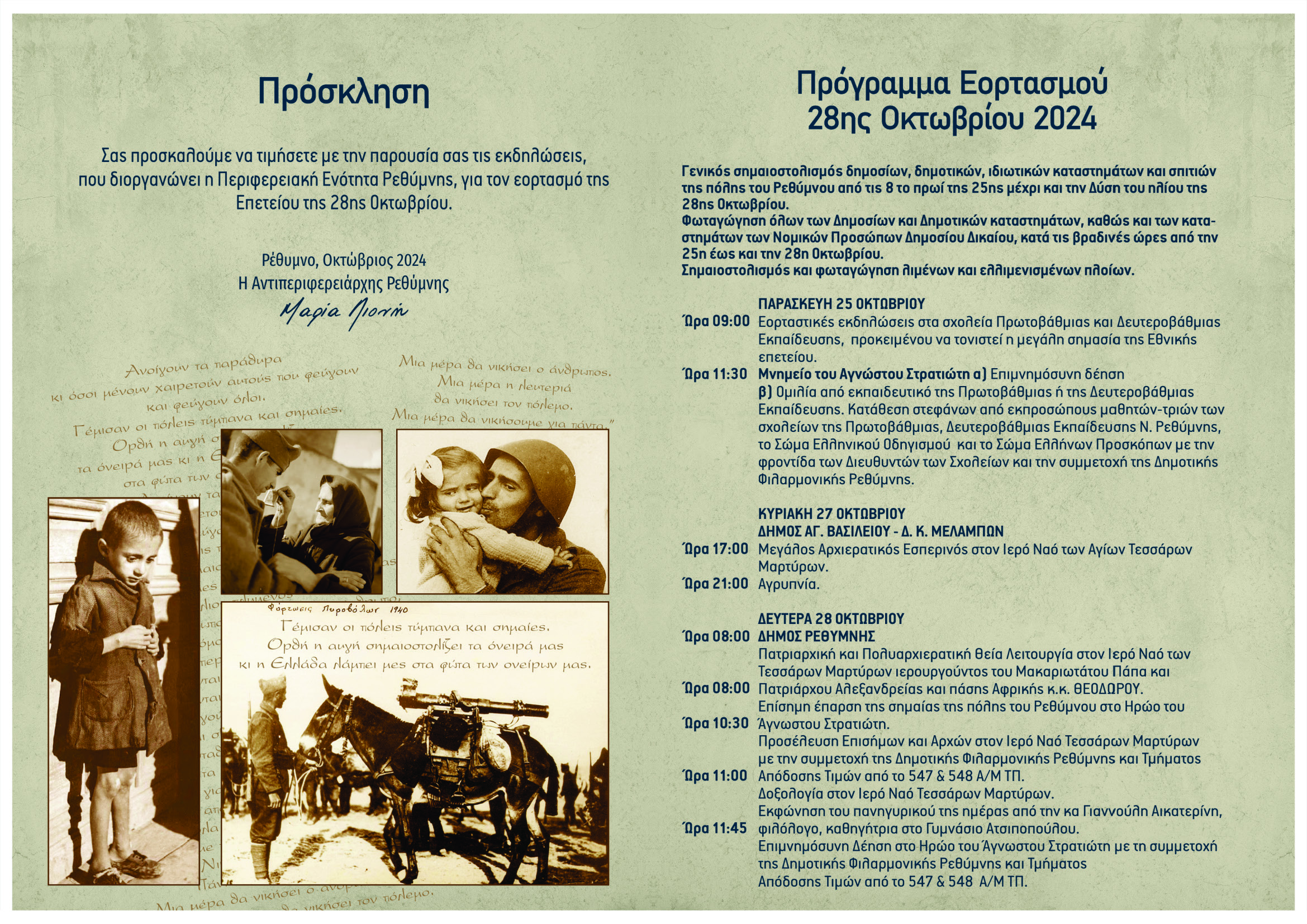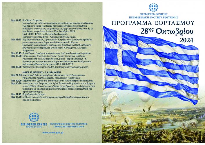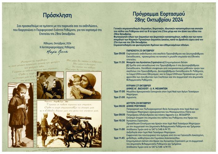 Γενικός σημαιοστολισμός δημοσίων, δημοτικών, ιδιωτικών καταστημάτων και σπιτιών της πόλης του Ρεθύμνου από τις 8 το πρωί της 25ης μέχρι και την Δύση του ηλίου της 28ης Οκτωβρίου.