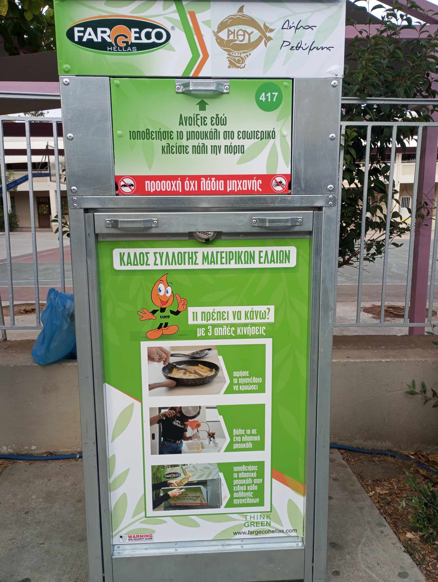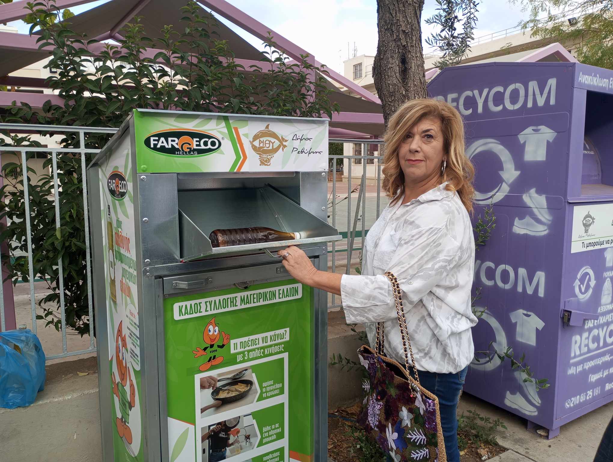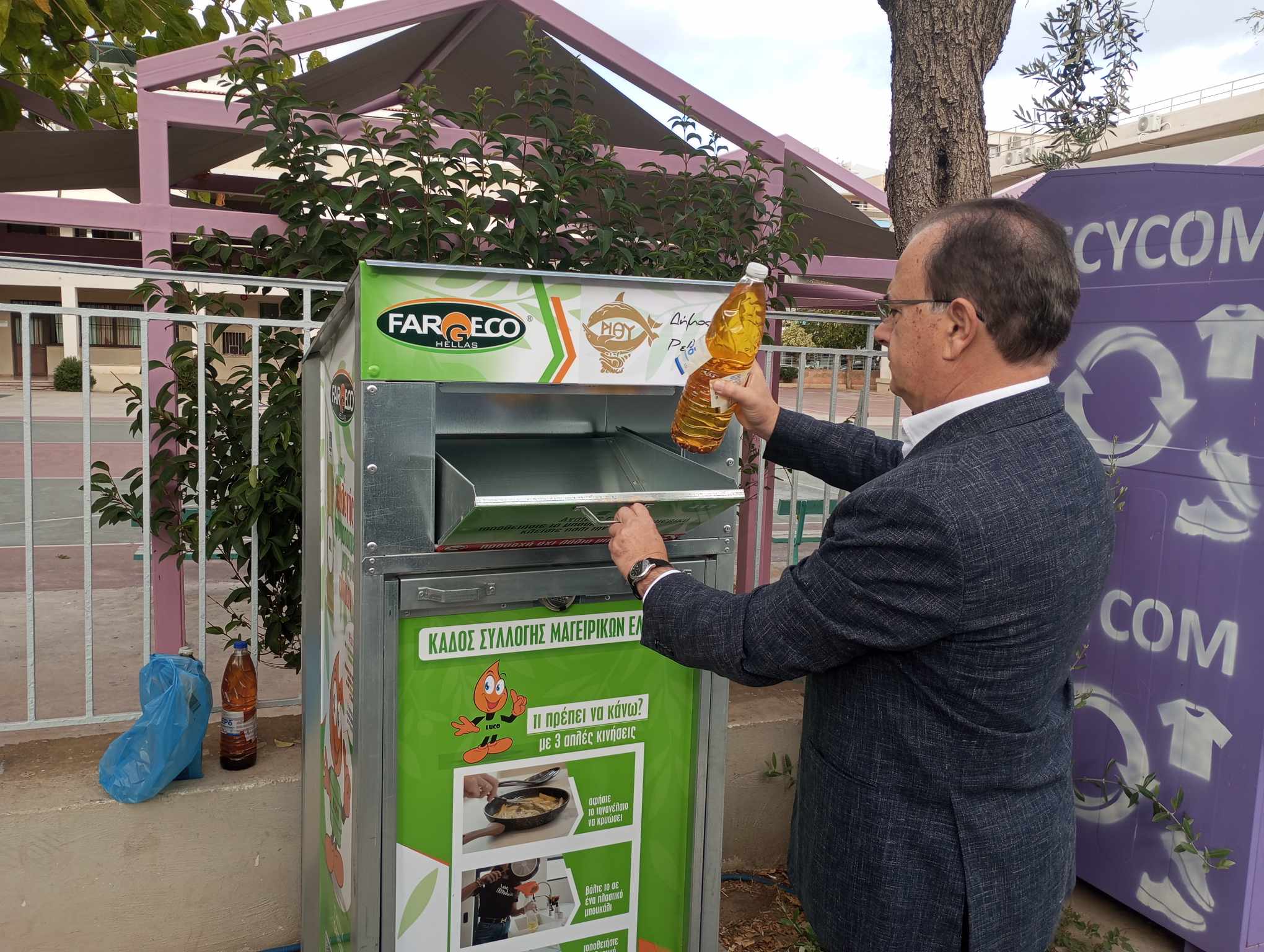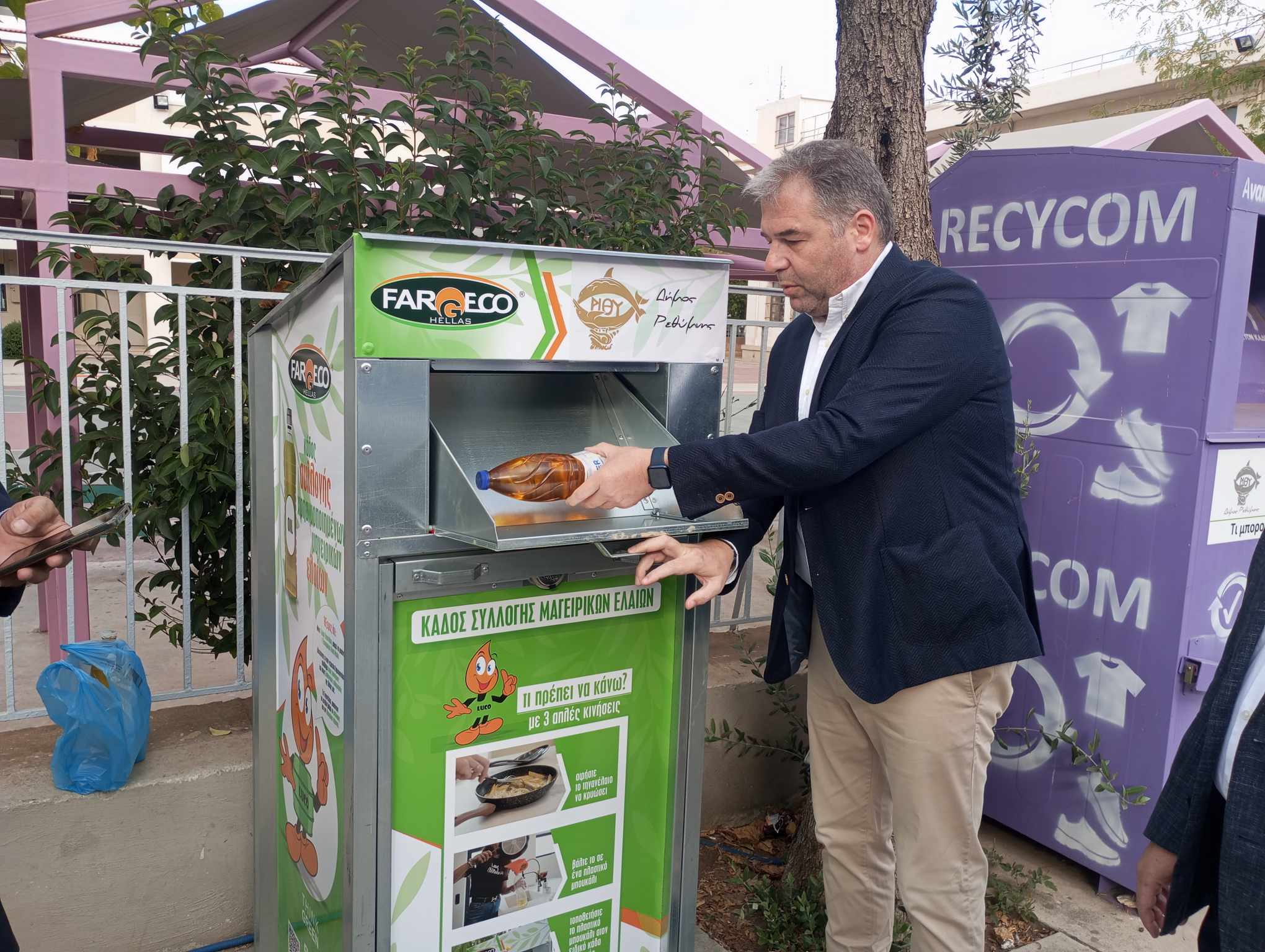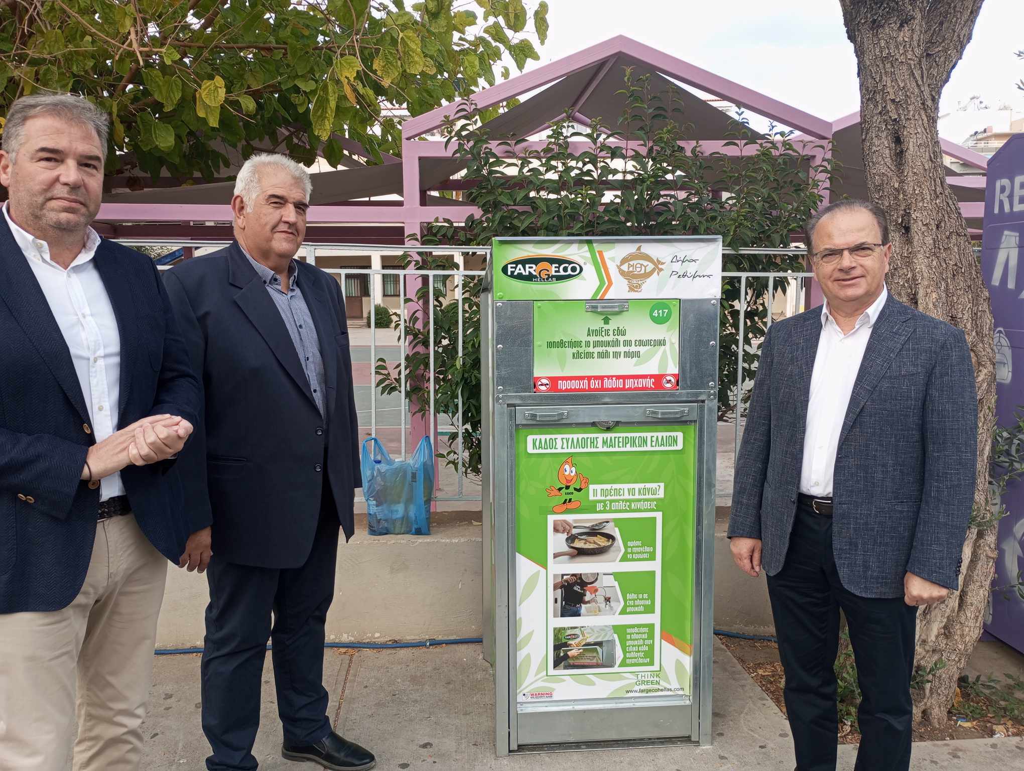 Τέλος, ο εκπρόσωπος της Fargeco Hellas κ. Δημήτρης Τριανταφυλλίδης δήλωσε: «Είναι μία προσπάθεια, μία καινούργια ροή, για να μην φεύγουν τα λάδια στο δίκτυο των Δήμων. Παρέχουμε προστασία των δικτύων του Δήμου, αλλά και της φύσης. Ένα λίτρο λάδι μολύνει περίπου 1 εκατομμύριο λίτρα νερό. Οι κάδοι βρίσκονται σε 25 σημεία και είναι πολύ σημαντικό να υποστηρίξουν αυτή την πρωτοβουλία οι πολίτες του Ρεθύμνου».