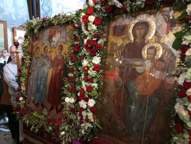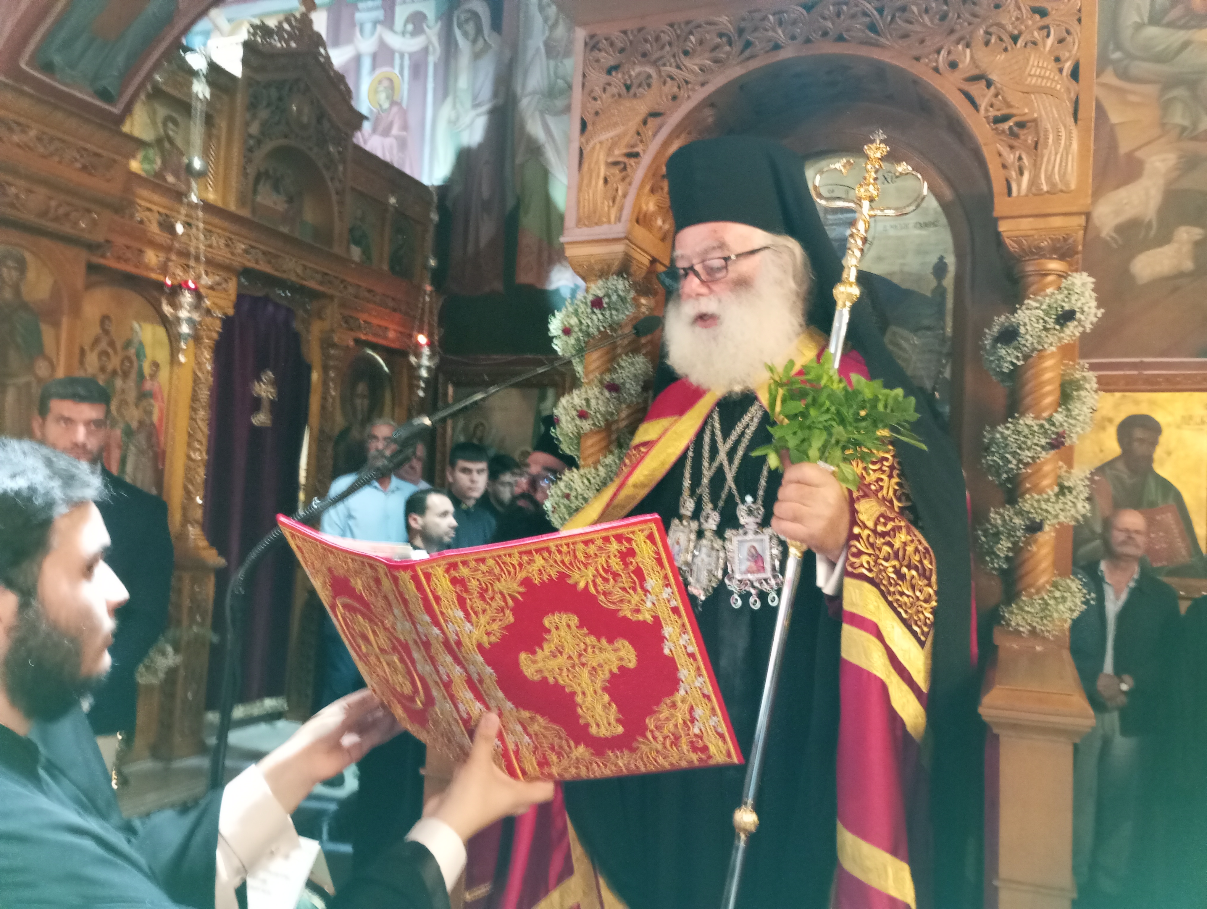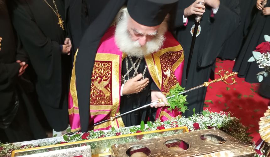 Ο Μακαριώτατος ανέβηκε στον θρόνο και προέστη του Πατριαρχικού Πανηγυρικού Εσπερινού ευλογώντας τους πιστούς που είχαν κατακλείσει τον Ιερό Ναό που βρίσκεται στο σημείο όπου καρατομήθηκαν το 1824 οι Νεομάρτυρες Γεώργιος, Αγγελής, Μανουήλ και Νικόλαος.