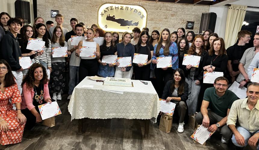 Η τελετή λήξης και απονομής των βεβαιώσεων παρακολούθησης, πραγματοποιήθηκε παρουσία όλων των μαθητών (Ελλήνων και ξένων) που συμμετείχαν, των καθηγητών τους και των γονέων που φιλοξένησαν και εξελίχθηκε σε μία αξέχαστη κρητική βραδιά.