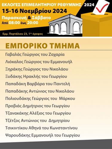 Η εκδήλωση παρουσίασης των υποψήφιων οι οποίοι θα λάβουν μέρος στις επικείμενες εκλογές του Επιμελητηρίου για την ανάδειξη του νέου Διοικητικού του Συμβουλίου (15 και 16 Νοεμβρίου 2024), συνοδεύτηκε από παρουσίαση των βιογραφικών τους, καθώς και από πληροφοριακό υλικό, σχετικό με το πλήθος των δράσεων που υλοποίησε η απερχόμενη Διοίκηση του κατά το διάστημα 2017 -2024.