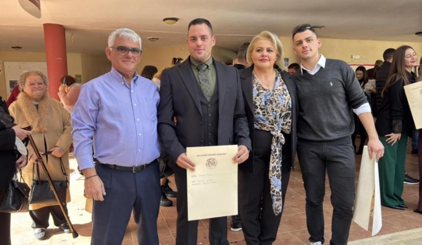 Στην απονομή που έγινε στο Πανεπιστήμιο Κρήτης, δίπλα του βρέθηκαν οι γονείς του Γιώργος και Ειρήνη, οι γιαγιάδες του και αγαπημένος του αδελφός Ανδρέας, που του ευχήθηκε καλή σταδιοδρομία με μαντινάδες.