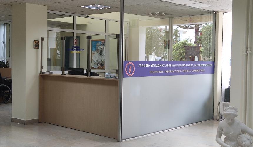 Το Γραφείο Υποδοχής βρίσκεται στο ισόγειο (κύρια είσοδος) του Νοσοκομείου και λειτουργεί καθημερινά από τις 7:00π.μ. έως τις 15:00μ.μ .