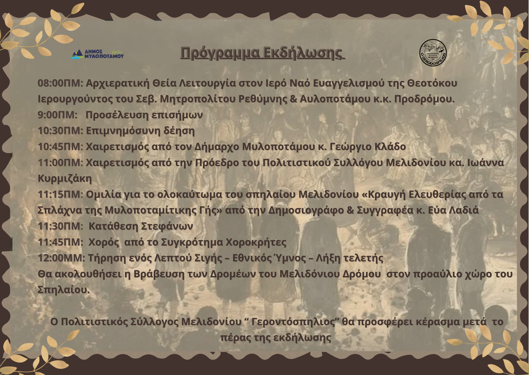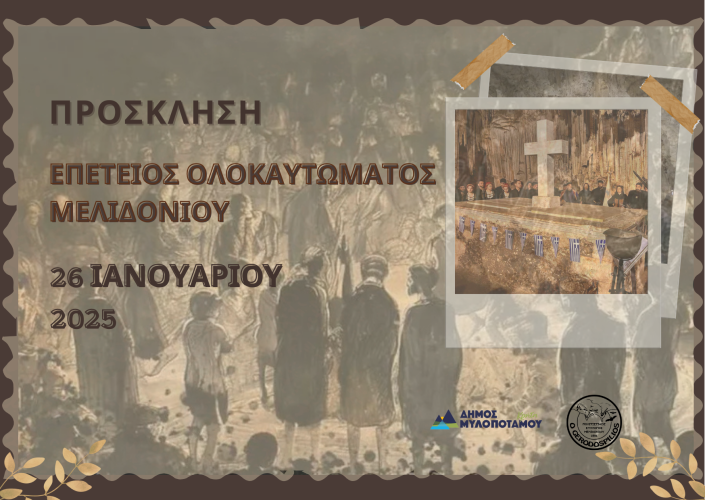 Ο Δήμος Μυλοποτάμου και ο Πολιτιστικός Σύλλογος Μελιδονίου «Γεροντόσπηλιος» έχουν την τιμή να σας προσκαλέσουν στην εκδήλωση τιμής και μνήμης για την Επέτειο του Ολοκαυτώματος του Μελιδονίου. Η εκδήλωση θα πραγματοποιηθεί την Κυριακή 26 Ιανουαρίου 2025, στο ιστορικό Σπήλαιο Μελιδονίου.