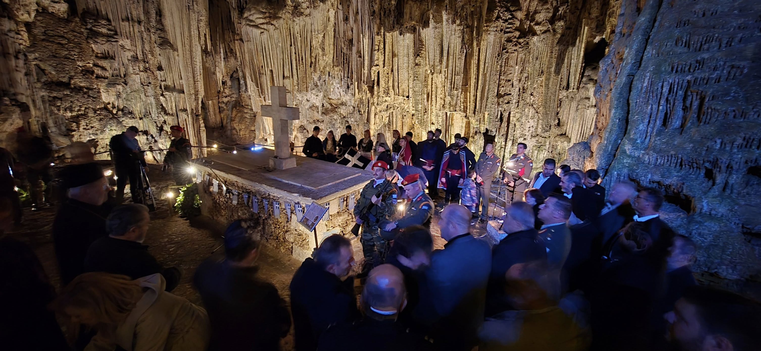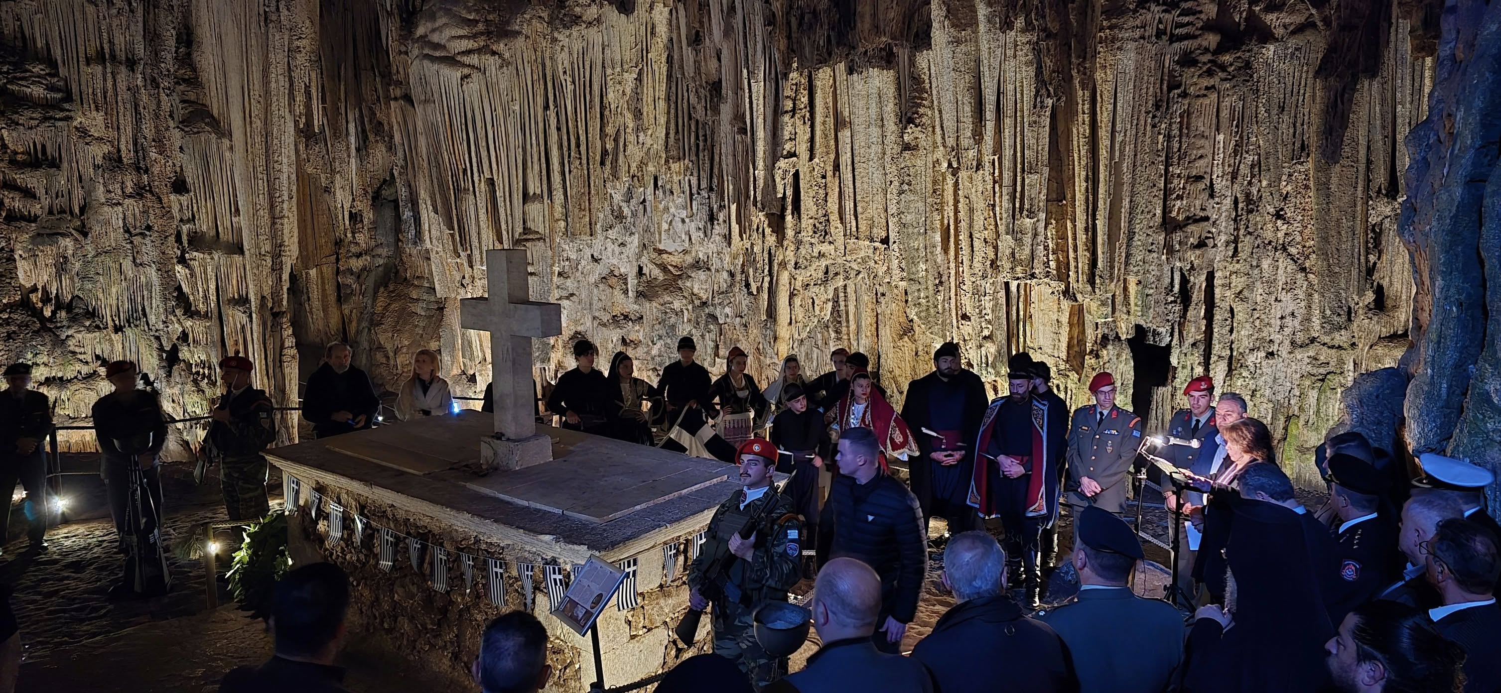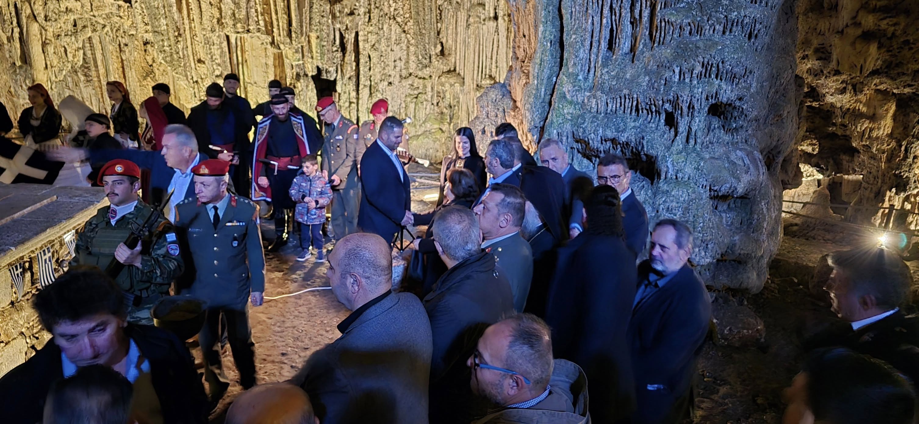 Η αψιδωτή είσοδος του σπηλαίου , μας υποδέχεται ενώ μας οδηγεί στην πρώτη αίθουσα του φαντασμαγορικού σπηλαίου που ονομάζεται "Αίθουσα ηρώων" όπου υπάρχει , όπως αναφέραμε και πιο πριν το "Μνημείoν". Ένα συγκρότημα από σταλαγμίτες αρχίζει και ξετυλίγεται σαν κουβάρι από μπροστά μας ενώ οδεύουμε προς το "Σταυροδρόμι" μπαίνοντας στο δεξιό θάλαμο . Φτάνοντας στη τεράστια αίθουσα "Πάσλεϋ" οι σταλαγμίτες και οι σταλακτίτες , δημιουργούν θαυμάσιο σύμπλεγμα και προσφέρουν ένα ονειρικό θέαμα στον επισκέπτη.