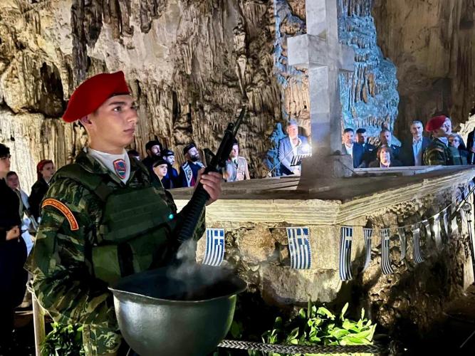 Σήμερα, 201 χρόνια μετά το ολοκαύτωμα του Σπηλαίου, σας υποδέχομαι με δέος και βαθιά συγκίνηση σε αυτόν τον ιερό τόπο. Εδώ, όπου η ιστορία δεν είναι απλώς μια ανάμνηση, αλλά μια ζωντανή μαρτυρία θυσίας και μεγαλείου. Εδώ, στον Γεροντόσπηλιο, που κάθε πέτρα, κάθε ανάσα της γης φέρει τη μαρτυρία μιας εποχής που η ανθρώπινη ψυχή υπερέβη τα όρια της θνητότητας για να υψωθεί στο αιώνιο. Εδώ, όπου η σιωπή δεν είναι απουσία, αλλά μνημείο. Μια σιωπή γεμάτη ψιθύρους θυσίας και ύμνους ανδρείας. Όπως τότε, έτσι και τώρα, αυτός ο τόπος είναι ο καθρέφτης της ψυχής μας, ένα σύμβολο που μας υπενθυμίζει ότι η ελευθερία δεν χαρίζεται αλλά κερδίζεται με θυσίες, αρετή και πίστη στα υψηλότερα ιδανικά.