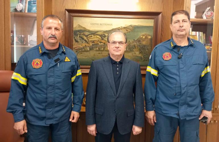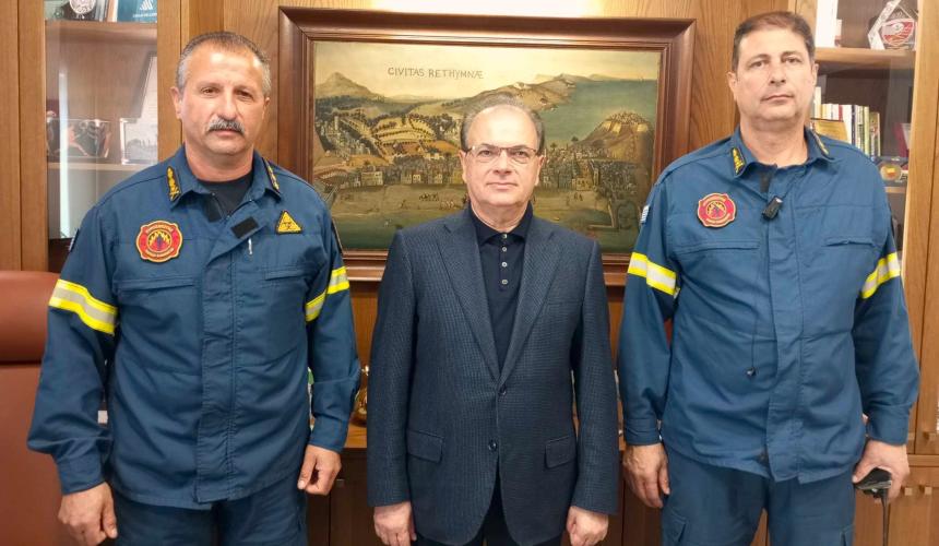 Ο Δήμαρχος Ρεθύμνης κ. Γιώργης Χ. Μαρινάκης υποδέχθηκε σήμερα στο γραφείο του το νέο Διοικητή των Πυροσβεστικών Υπηρεσιών της Π.Ε. Ρεθύμνου, Πύραρχο Νικόλαο Τζανιδάκη, τον οποίο συνόδευε το Διοικητής της Πυροσβεστικής Υπηρεσίας Πόλεως Ρεθύμνου, Αντιπύραρχος Δημήτρης Δρυγιαννάκης.