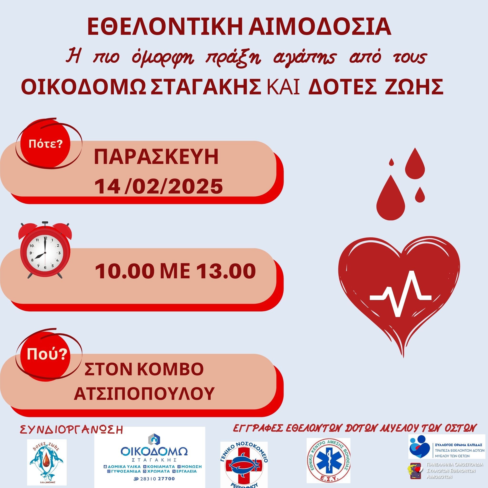 Η διοίκηση και το προσωπικό της εταιρίας "ΟΙΚΟΔΟΜΩ ΣΤΑΓΑΚΗΣ" σε συνεργασία με τον Σύλλογο Εθελοντών Αιμοδοτών Ν. Ρεθύμνου ΔΟΤΕΣ ΖΩΗΣ, σας προσκαλεί να συμμετέχετε σε μία όμορφη πράξη αγάπης προσφέροντας εθελοντικά αίμα,