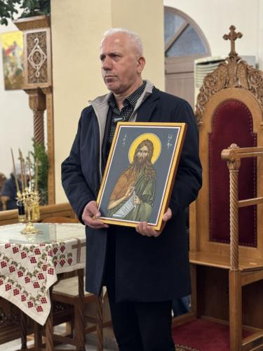 Προ της απολύσεως του Εσπερινού, ο Εφημέριος της Ενορίας, Αιδεσιμολ. Πρωτοπρεσβύτερος Νικόλαος Ζωλοτάκης, προσέφερε στο Σεβασμιώτατο ιερά εικόνα του Τιμίου Προδρόμου, έργο της Σχολής Αγιογραφίας της Ενορίας Γάλλου.