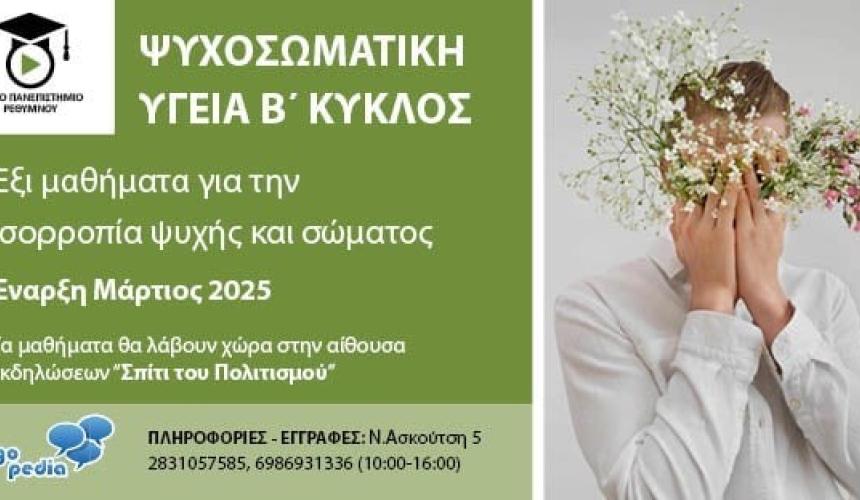 Ο νέος κύκλος μαθημάτων αφορά την Ψυχοσωματική Υγεία και το θέμα του είναι «Ψυχοσωματική Υγεία- Έξι μαθήματα για την ισορροπία Ψυχής και Σώματος».