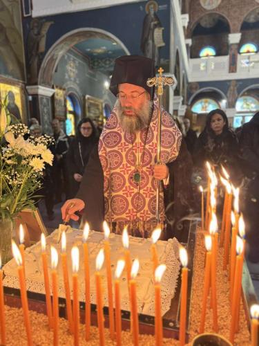 Στο τέλος του Εσπερινού, συμπαραστατούμενος υπό των νέων Εφημερίων της Ενορίας, ανέγνωσε Τρισάγιο επί των προσκομισθέντων κολλύβων και μνημόνευσε τα ονόματα των κεκοιμημένων.