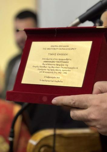 Με λόγους συγκινητικούς τον Σεβασμιώτατο προσεφώνησε ο Εφημέριος π. Παναγιώτης Παπαδάκης, ο οποίος αναφέρθηκε και στα δύο πρόσωπα των οποίων τα Μνημόσυνα τελέσθηκαν και παρεκάλεσε τον Σεβασμιώτατο να επιδώσει τιμητική πλακέτα αναγνώρισης και τιμής στους κατά σάρκα συγγενείς του αειμνήστου Αρχιμανδρίτου Αθανασίου Τσουπάκη, ως ελάχιστο αντίδωρο ευγνωμοσύνης για την πολυτίμητη προσφορά του.