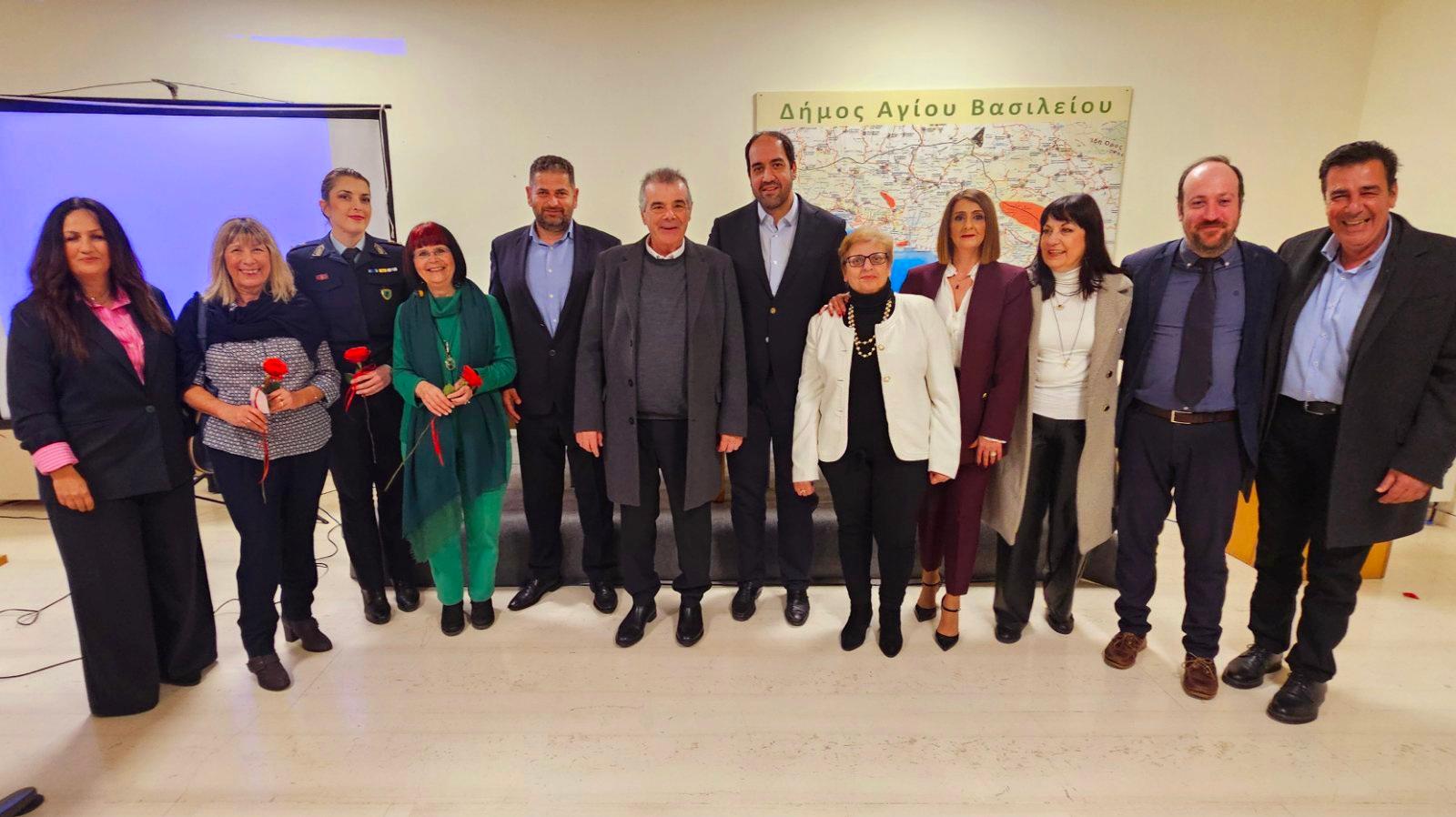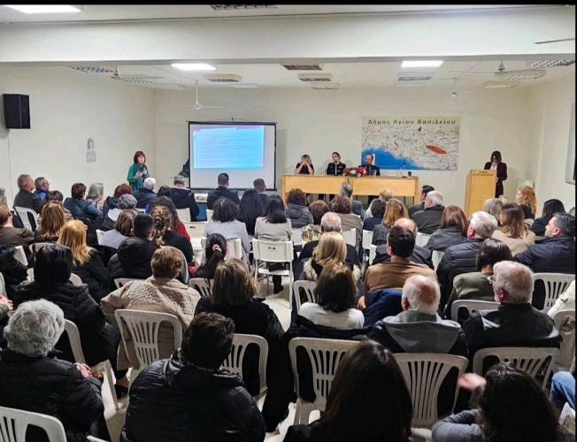 Με αφορμή την Παγκόσμια Ημέρα της Γυναίκας ο Δήμος Αγίου Βασιλείου διοργάνωσε εκδήλωση το βράδυ του Σαββάτου στην κατάμεστη αίθουσα εκδηλώσεων του Δημαρχείου με θέμα την ενδοοικογενειακή βία με σκοπό την ενημέρωση και την ευαισθητοποίηση του κοινού.