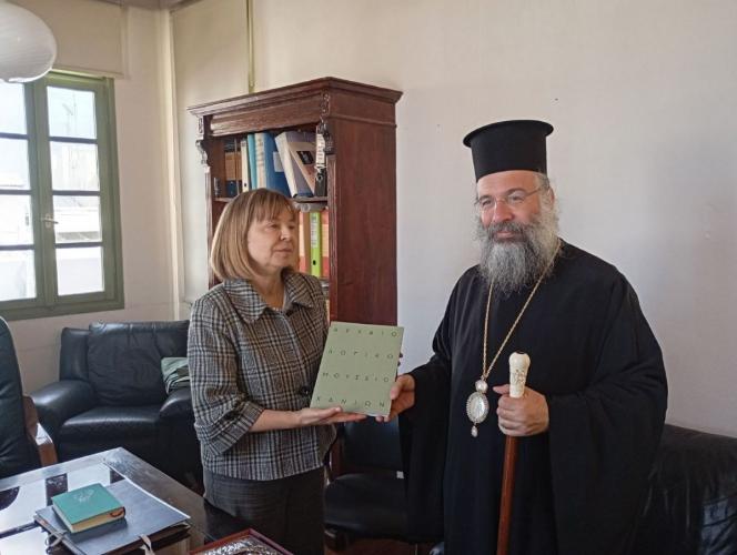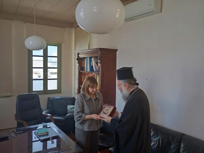 Ο Σεβασμιώτατος εξέφρασε εγκάρδιες ευχές στην κ. Προϊσταμένη, την διαβεβαίωσε για την άριστη συνεργασία, με σκοπό τη συντήρηση και ανάδειξη των εκκλησιαστικών μνημείων της Τοπικής μας Εκκλησίας, και την ευχαρίστησε για την άμεση και παραγωγική ανάληψη των καθηκόντων της στην Εφορεία Αρχαιοτήτων Ρεθύμνου, προφέροντάς της Ιερά Εικόνα, αντίγραφο της Παναγίας του Χάρακα, προς ευλογία της νέας της υπηρεσίας στον τόπο μας.