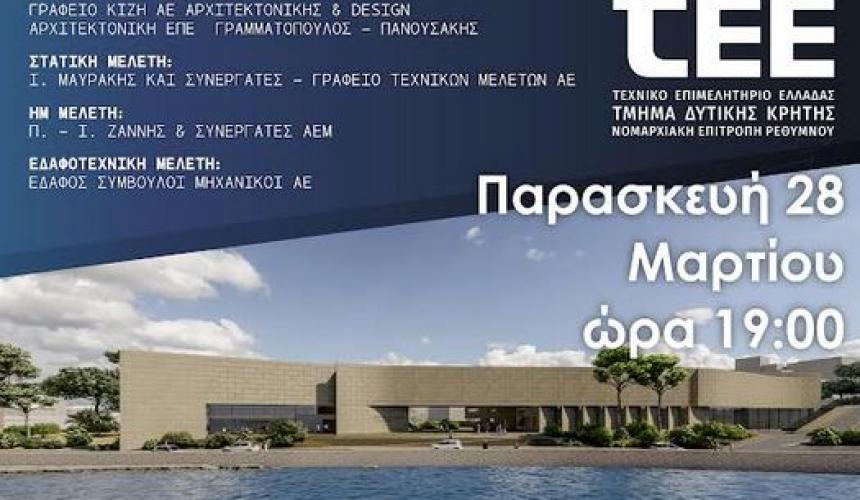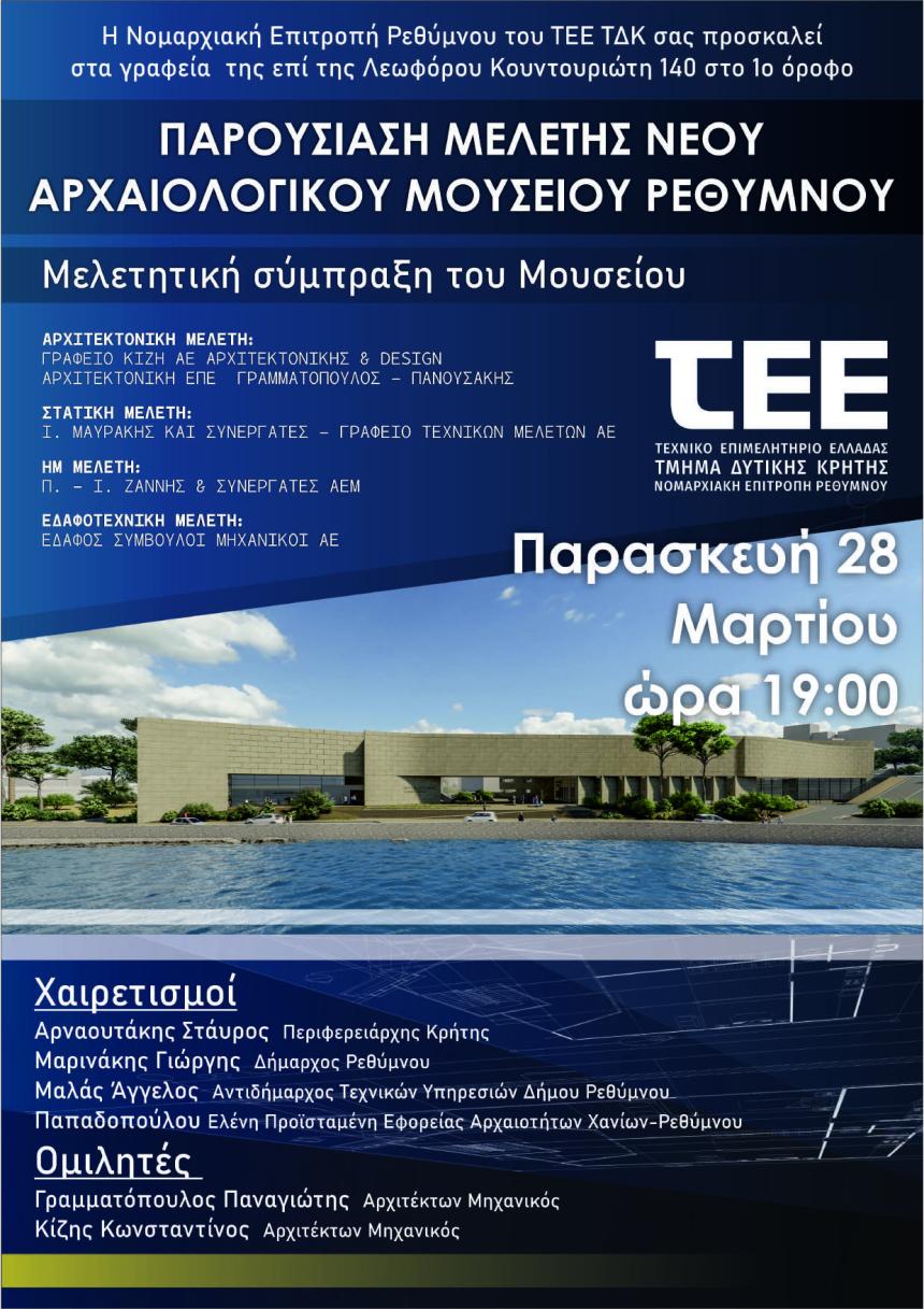 Εκ μέρους της Νομαρχιακής Επιτροπής Ρεθύμνου του ΤΕΕ - Τμήμα Δυτικής Κρήτης σας προσκαλούμε στην παρουσίαση της «Μελέτης του Νέου Αρχαιολογικού Μουσείου Ρεθύμνου», την Παρασκευή 28 Μαρτίου και ώρα 19:00 στα γραφεία της ΝΕ, επί της Λεωφόρου Κουντουριώτη 140, στον 1ο όροφο.