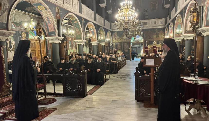 Στο τέλος του Εσπερινού, ο Σεβασμιώτατος παρουσίασε τον ορισθέντα ομιλητή, Πανοσιολ. Αρχιμ. Βασίλειο Παπαδάκη, Ιεροκήρυκα της Ιεράς Μητροπόλεως και Ηγούμενο της Ιεράς Μονής Αγίας Αναστασίας της Ρωμαίας Ρεθύμνης, ο οποίος, στη συνέχεια, ανέπτυξε θεολογικώτατα, σύμφωνα με την πατερική γραμματεία και την εμπειρία της Αγίας μας Εκκλησίας, το θέμα: «Πώς νοείται θεολογικά η εξέλιξη του ανθρώπου;», επισημαίνοντας σπουδαίες και σημαντικές πτυχές από τη θεολογία του Αγίου Γρηγορίου, Αρχιεπισκόπου Θεσσαλονίκης, του Παλαμά.