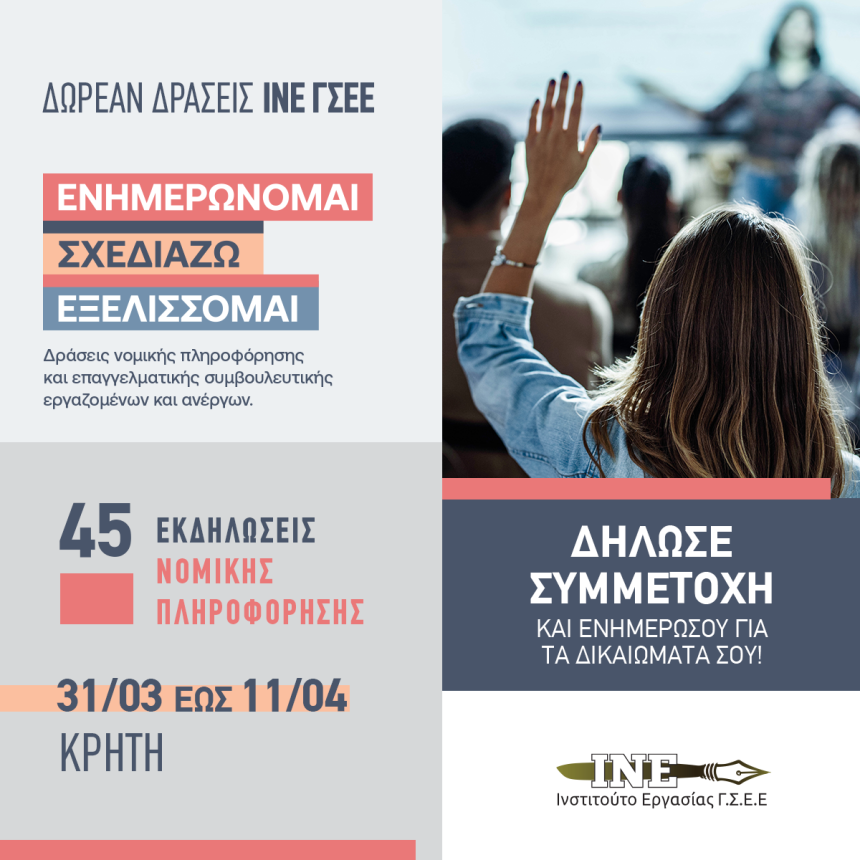 Το ΙΝ.Ε./Γ.Σ.Ε.Ε. διοργανώνει Ομαδική δια ζώσης Νομική Πληροφόρηση με τίτλο: «Ψηφιακή Κάρτα Εργασίας», κατά την οποία νομικοί συνεργάτες του ΙΝ.Ε./Γ.Σ.Ε.Ε. θα αναλύσουν το παραπάνω θέμα.