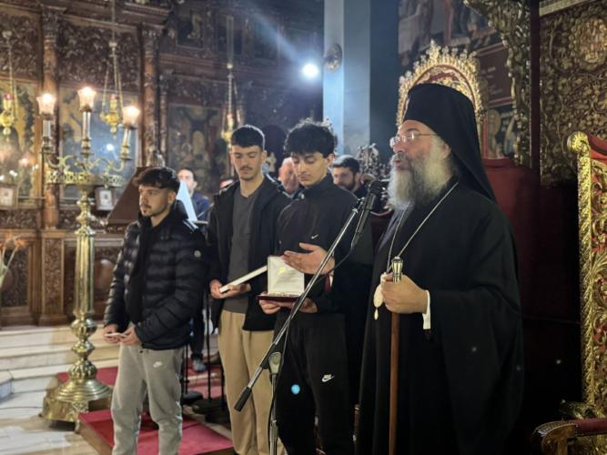 Ο Σεβασμιώτατος παρεκάλεσε τον π. Αγαθάγγελο, ευχαριστώντας τον, να παραλάβει επετειακά δώρα της Ιεράς Μητροπόλεώς μας από τα χέρια νέων παιδιών του τόπου μας, τα οποία παρακολούθησαν με ενδιαφέρον την ομιλία.