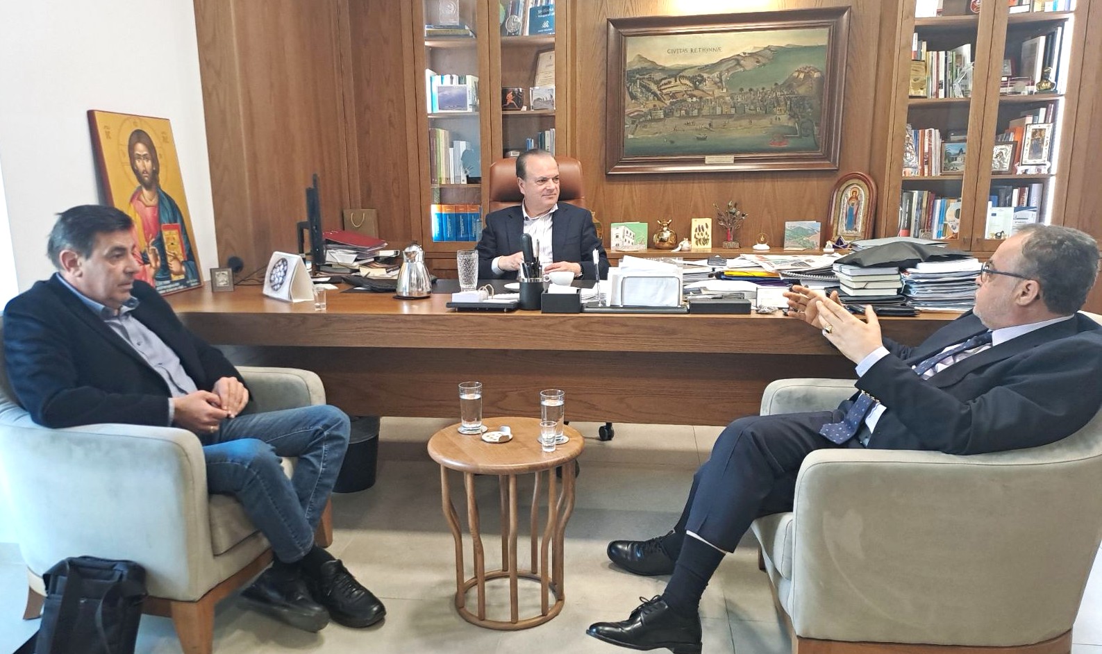 Στην διαβεβαίωση αυτή προχώρησε ο Δήμαρχος κ. Γιώργης Χ. Μαρινάκης κατά τη διάρκεια της εθιμοτυπικής συνάντησης που είχε το μεσημέρι στο γραφείο του με τους εκπροσώπους του νέου Εφορευτικού Συμβουλίου του πνευματικού ιδρύματος, τον Πρόεδρο κ. Κωνσταντίνο Σπανουδάκη, τον Αντιπρόεδρο κ. Νίκο Δερεδάκη και το Αν. μέλος κ. Αιμηλία Μιχελιδάκη.
