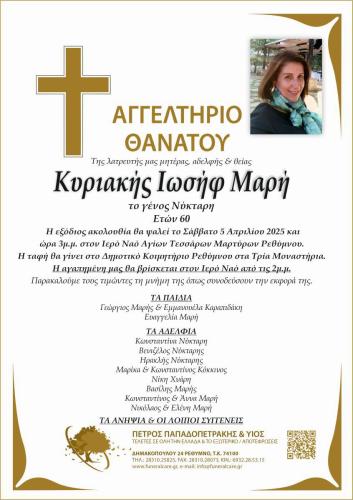 Η Κυριακή Μαρή έφυγε χθες σε ηλικία 60 εών και η εξόδιος ακολουθία θα πραγματοποιηθεί σήμερα Σαββατο 05/04 στις 3:00 το μεσημέρι στον Ιερό Ναό των 4ων Μαρτύρων στο Ρέθυμνο.