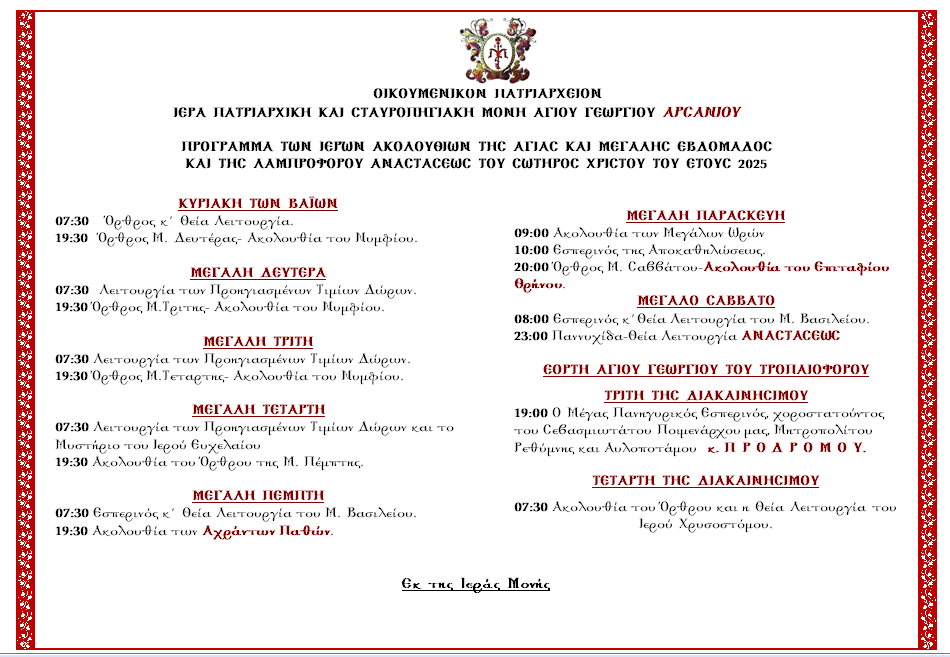 19:00 Ο Μέγας Πανηγυρικός Εσπερινός, χοροστατούντος του ΣεβασμιωτάτουΠοιμενάρχου μας, ΜητροπολίτουΡεθύμνης και Αυλοποτάμουκ. Π Ρ Ο Δ Ρ Ο Μ Ο Υ.