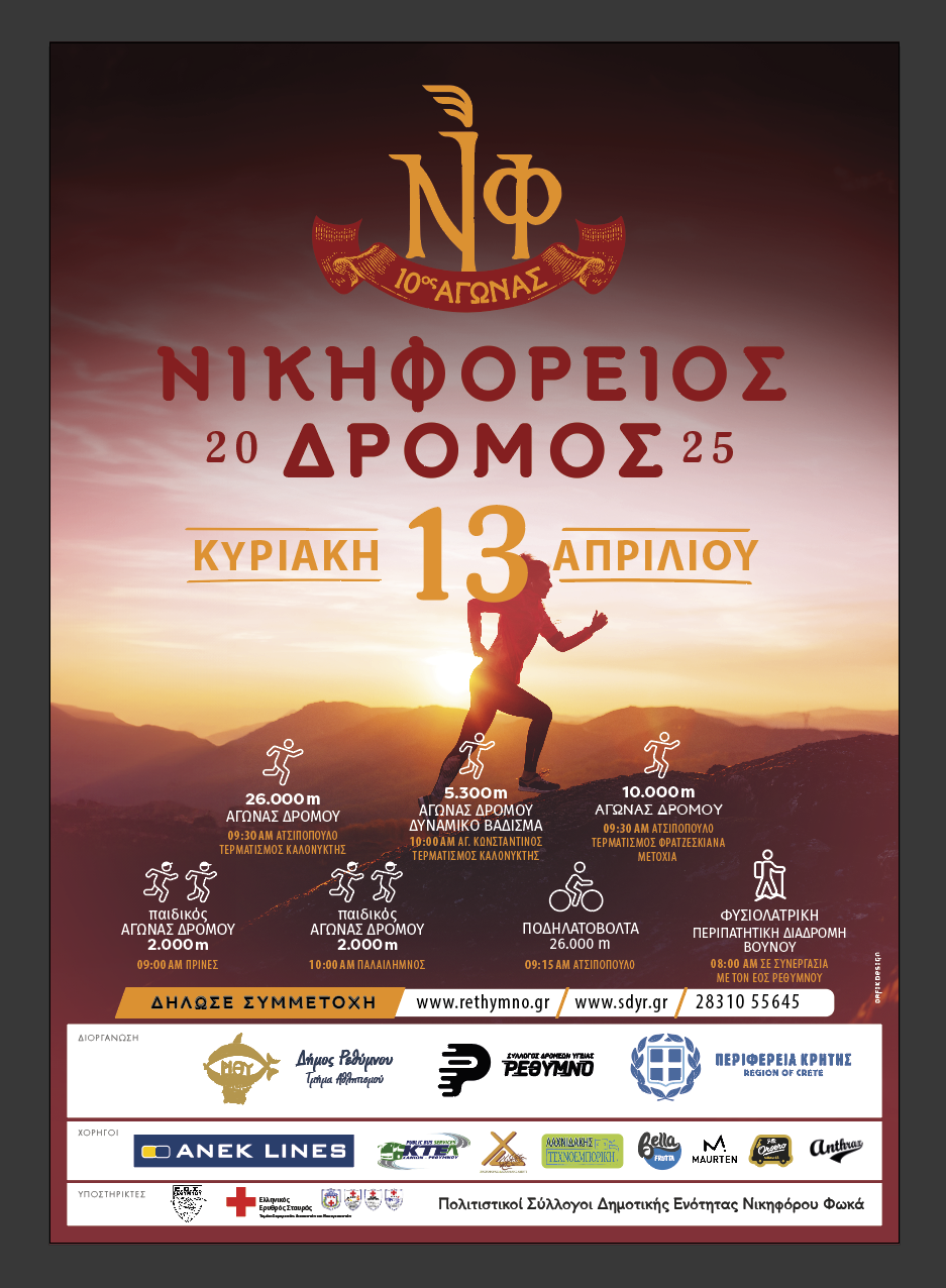 Ο 10ος Νικηφόρειος Δρόμος βρίσκεται ξανά στο επίκεντρο της αθλητικής και συνάμα της φυσιολατρικής δράσης με διοργανωτές το Τμήμα Αθλητισμού του Δήμου Ρεθύμνης και τον Σύλλογο Δρομέων Υγείας Ρεθύμνου, με την υποστήριξη της Περιφέρειας Κρήτης, της Περιφερειακής Ενότητας Ρεθύμνης και με την πολύτιμη συνδρομή των Πολιτιστικών Συλλόγων της Δημοτικής Ενότητας Νικηφόρου Φωκά και του Ελληνικού Ορειβατικού Συλλόγου Ρεθύμνου.