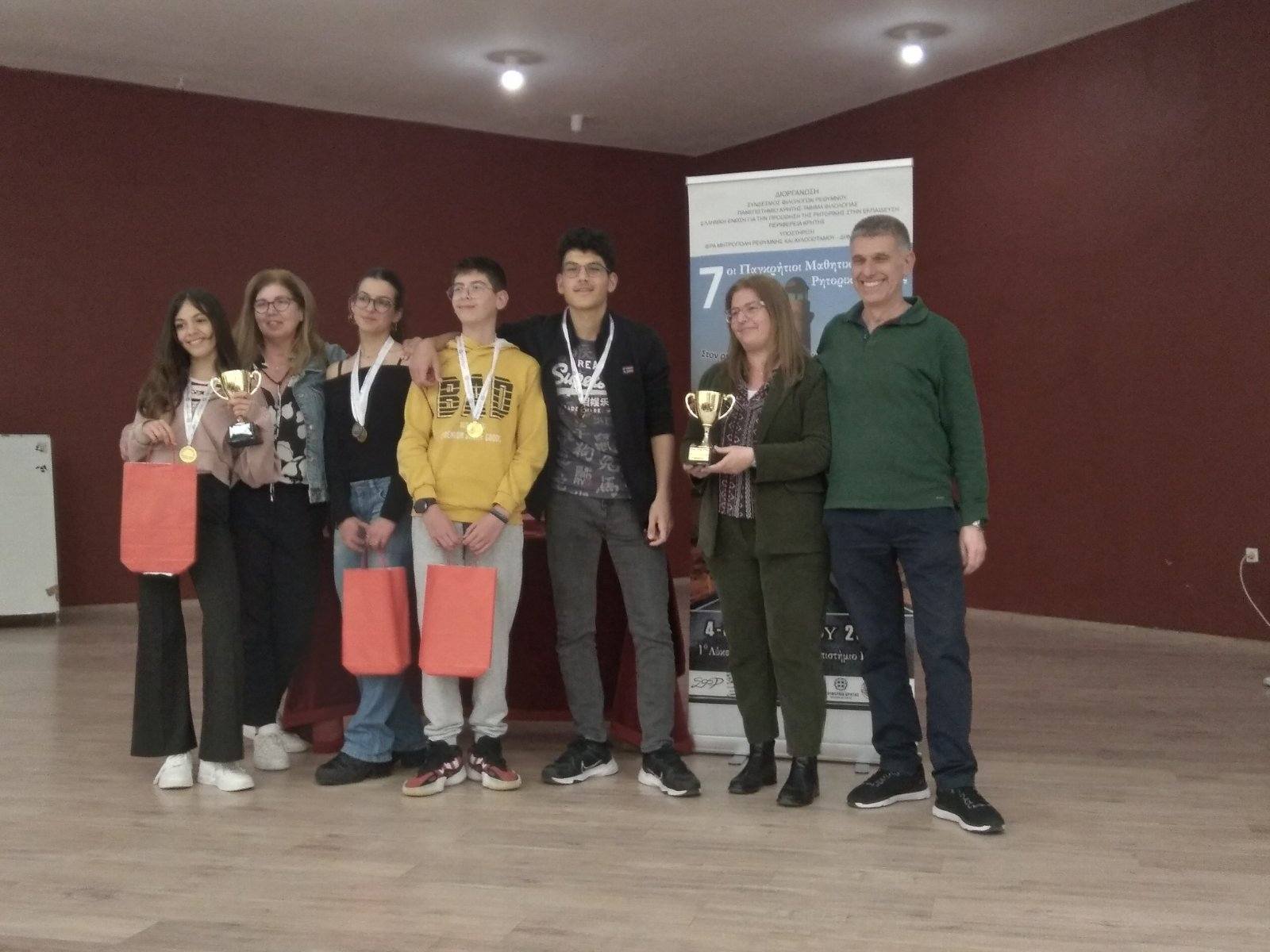 Το τριήμερο 4 με 6 Απριλίου πραγματοποιήθηκαν στο Ρέθυμνο οι 7οι παγκρήτιοι αγώνες ρητορικής τέχνης. Οι αγώνες διοργανώνονται από τον Σύνδεσμο φιλολόγων Ρεθύμνου, το τμήμα Φιλολογίας, την Ένωση για την προώθηση της ρητορικής στην εκπαίδευση και την Περιφέρεια Κρήτης, ενώ υποστηρίζονται από την Ιερά Μητρόπολη Ρεθύμνης και τον Δήμο Ρεθύμνης. Υπεύθυνες καθηγήτριες ήταν οι: Ειρήνη Σαλβαράκη και Ελένη Μαργαρίτη. Στους αγώνες συμμετείχαν σχολεία από όλη την Κρήτη και το 2ο Γυμνάσιο Ρεθύμνου ήταν ένα από αυτά. Μαθητές και μαθήτριες του ομίλου ρητορικής είχαν την ευκαιρία να πάρουν μέρος σ΄ αυτή την όμορφη διοργάνωση και να ζήσουν μία ξεχωριστή εμπειρία. Έτσι, οι μαθήτριες Ανυφαντάκη Ειρήνη, Βούλγαρη Αλεξάνδρα και ο μαθητής Τσιριντάνης Μανουήλ συμμετείχαν στο αγώνισμα του αυθόρμητου λόγου, οι μαθήτριες Μαραβελάκη Ελένη, Κουτάντου Νίκη και ο μαθητής Τζανιδάκης Γιάννης στο αγώνισμα του προτρεπτικού λόγου και οι Μαραβελάκη Ελένη, Τζανιδάκης Γιάννης και Παπαδόπουλος Κων/νος αποτέλεσαν την ομάδα των διττών λόγων και συμμετείχαν στο αγώνισμα των διττών (debate). Τα παιδιά έδωσαν τον καλύτερό τους εαυτό, μίλησαν με ελεύθερο, δημιουργικό και ευφάντα-στο τρόπο και με την ευγένεια και το ήθος τους μας έκαναν πραγματικά περήφανους. Θερμά συγχαρητήρια σε όλα τα παιδιά για την παρουσία τους και ιδιαίτερα στα παιδιά που διακρίθηκαν. Πολλά μπράβο στην Αλεξάνδρα Βούλγαρη για την πρώτη θέση πουκατέλαβε στο αγώνισμα του αυθόρμητου λόγου και στην ομάδα των διττών λόγων για την κατάκτηση της πρώτης θέσης στο debate!