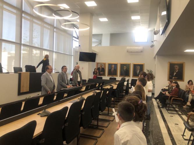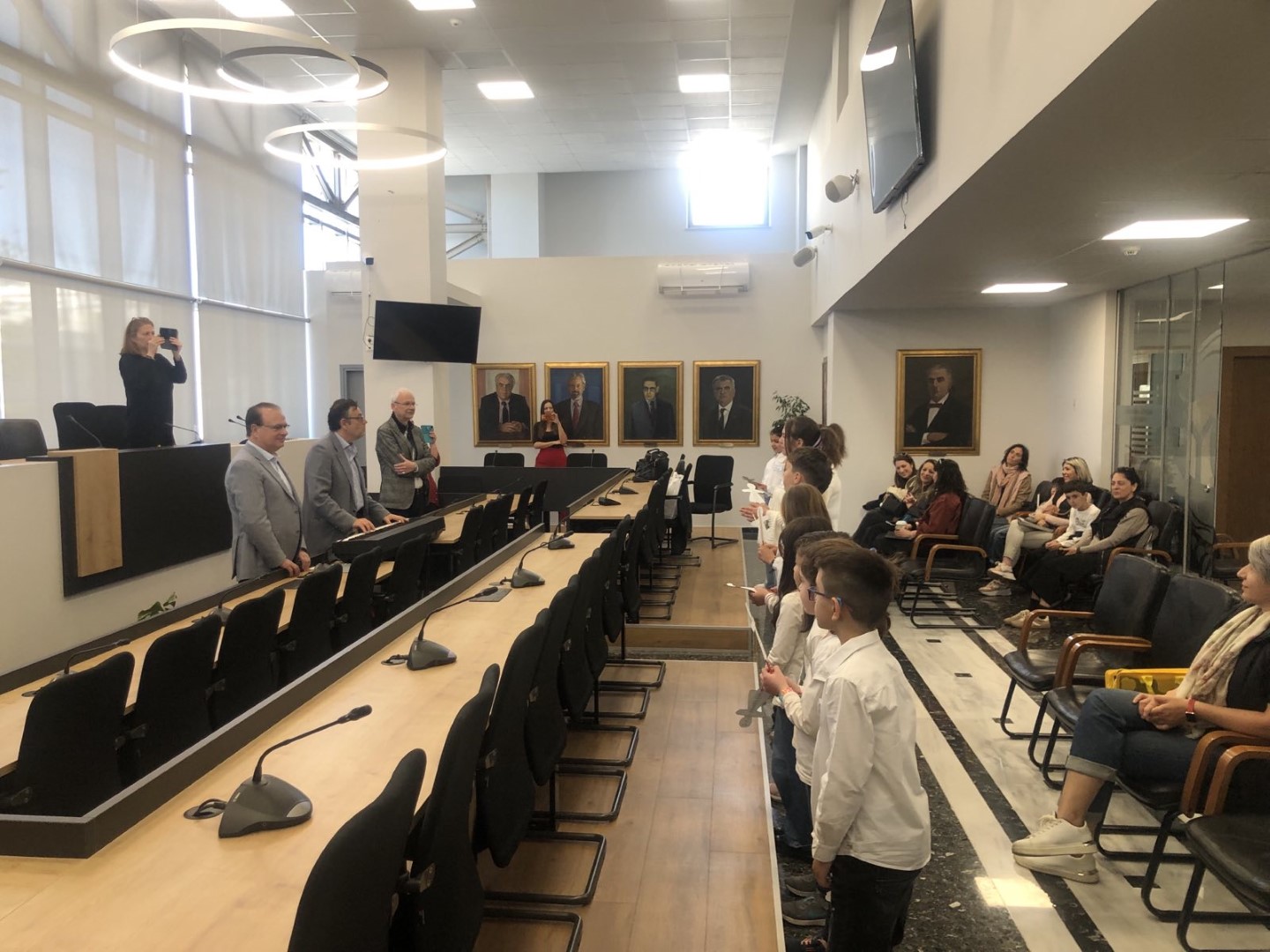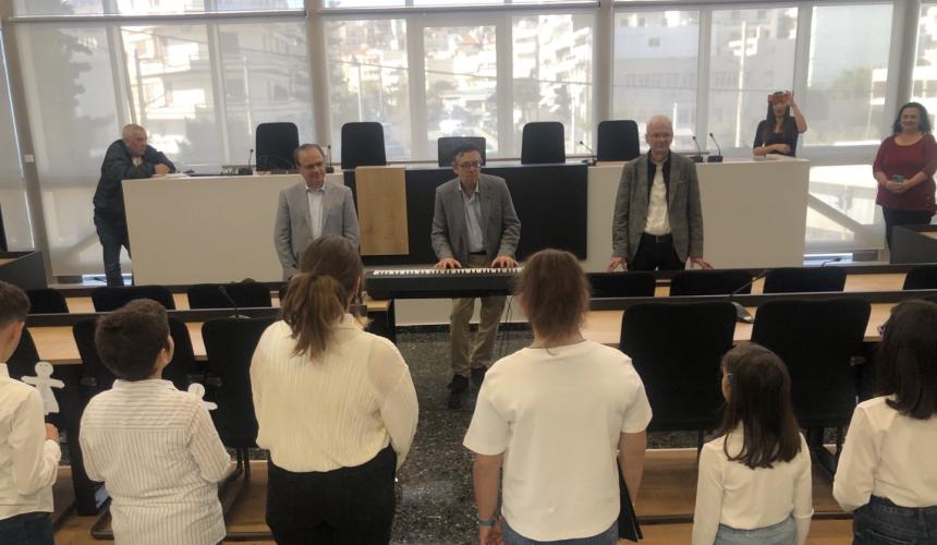 Τα 14 μέλη της χορωδίας καθοδηγούμενα από τον Καλλιτεχνικό Διευθυντή του Ωδείου Νίκο Περάκη επισκέφθηκαν εθιμοτυπικά το Δημαρχείο όπου τα καλωσόρισαν ο Δήμαρχος Γιώργης Μαρινάκης και ο Αντιδήμαρχος Πολιτισμού Μάνος Τσάκωνας.