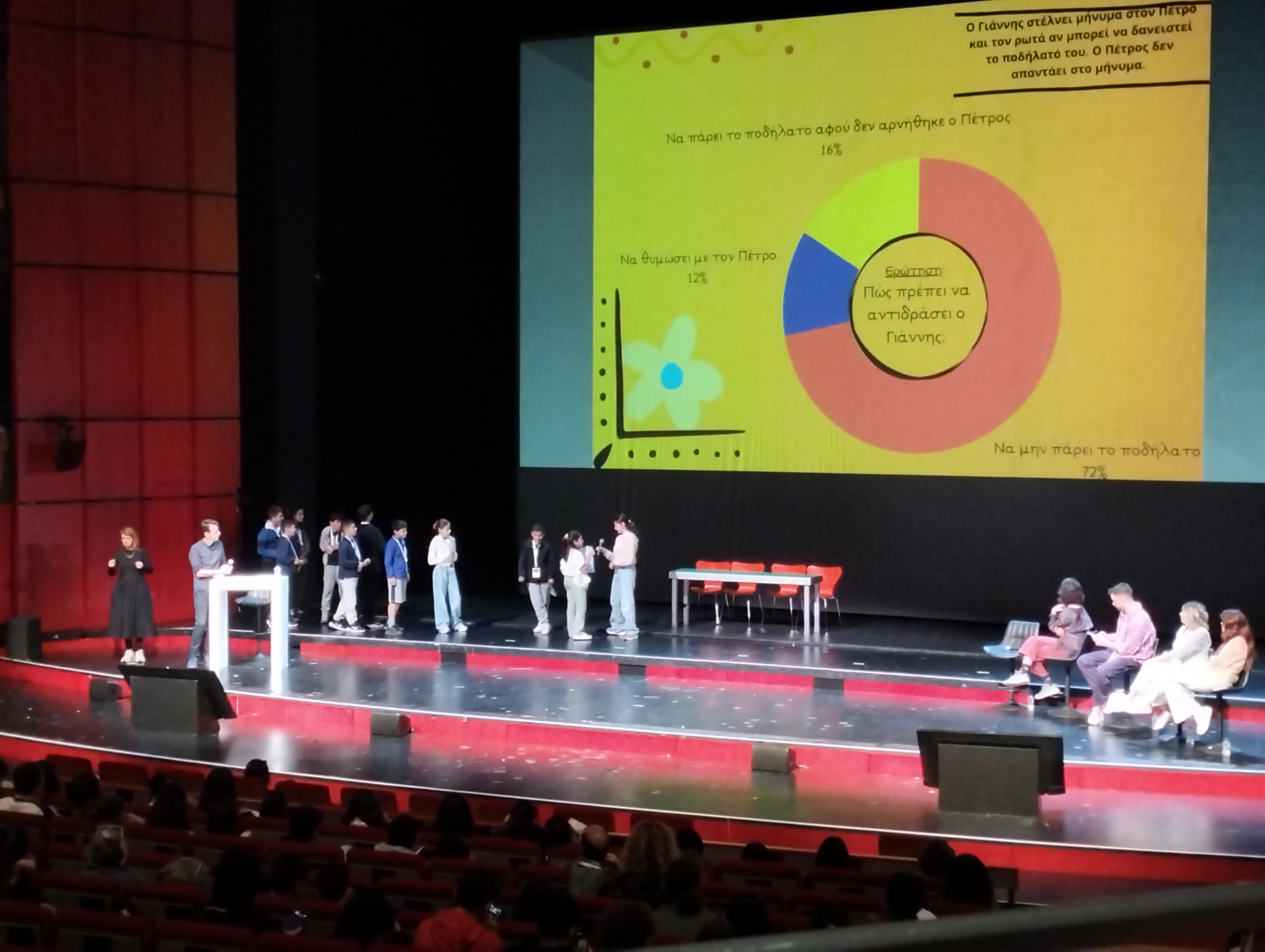 Οι μαθητές και οι μαθήτριες του 16ου στον επιβλητικό χώρο της Λυρικής Σκηνής πρόβαλαν ένα μικρό βίντεο με τις εντυπώσεις και τις προκλήσεις που αντιμετώπισαν στη διάρκεια του σχεδιασμού και της υλοποίησης της έρευνας, ενώ στη συνέχεια παρουσίασαν αναλυτικά τα σημαντικότερα από τα ευρήματά τους, τις παρατηρήσεις, τα συμπεράσματα και τις προτάσεις τους με βάση την ερευνητική τους εμπειρία.