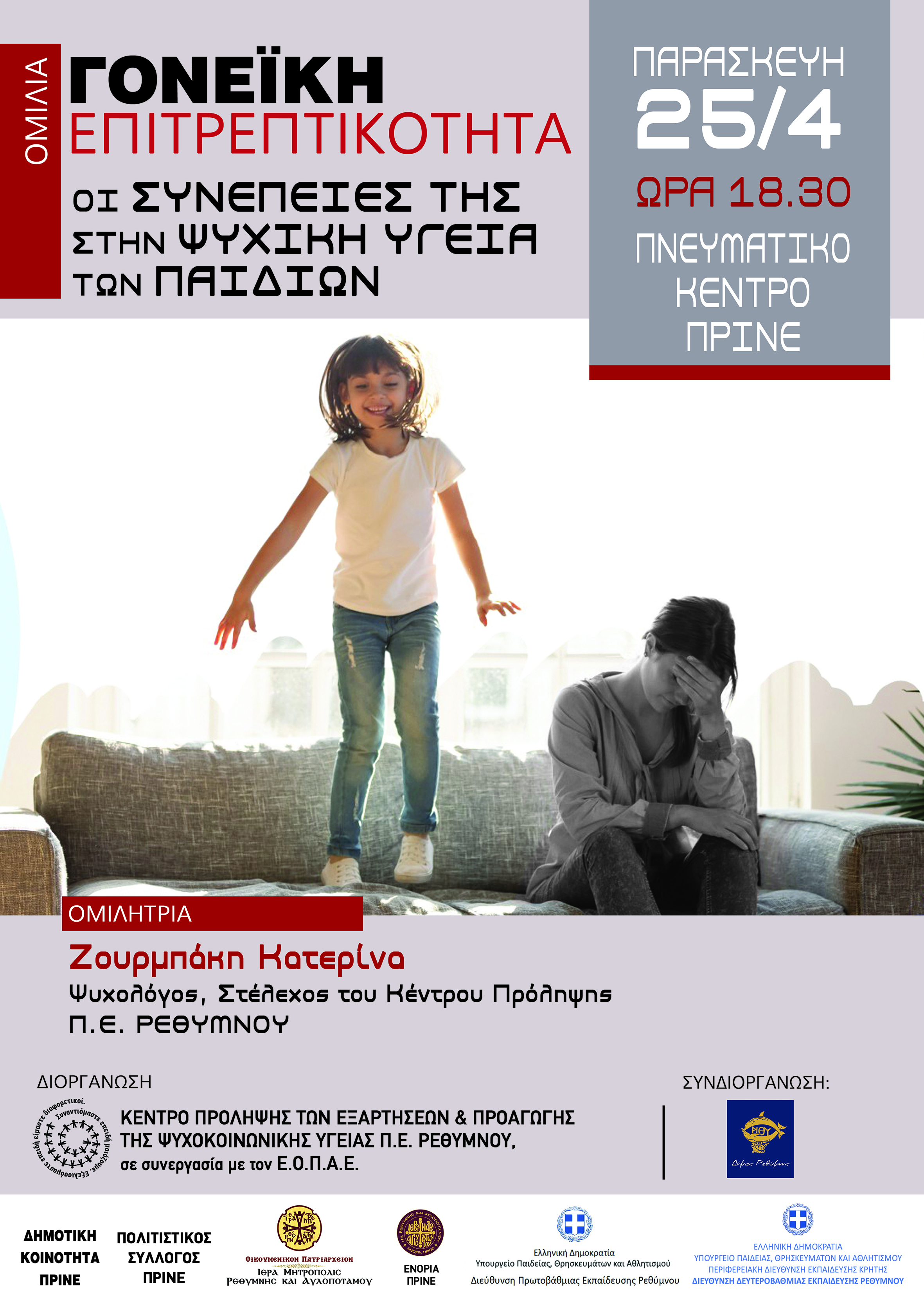 Το Κέντρο Πρόληψης των Εξαρτήσεων και Προαγωγής της Ψυχοκοινωνικής Υγείας Π.Ε Ρεθύμνης, στα πλαίσια της συνεργασίας του με τους Δήμους της Π.Ε. Ρεθύμνου, την Ιερά Μητρόπολη Ρεθύμνης και Αυλοποτάμου και την Ιερά Μητρόπολη Λάμπης και Σφακίων, τις Διευθύνσεις Πρωτοβάθμιας και Δευτεροβάθμιας Διεύθυνσης Ρεθύμνου και τους κατά τόπους φορείς και Πολιτιστικούς Συλλόγους συνεχίζει τη σειρά ομιλιών για γονείς με θέμα: «Γονεϊκή Επιτρεπτικότητα: οι συνέπειες στην ψυχική ζωή των παιδιών», σε όλη την Περιφερειακή ενότητα Ρεθύμνου.