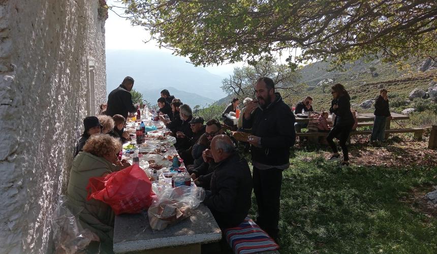 Μετά το πέρας της λειτουργίας, οι συμμετέχοντες άπλωσαν τα φαγητά που είχαν φέρει μαζί τους και στρώθηκε πρόχειρο αλλά πλούσιο τραπέζι, με παραδοσιακά εδέσματα, πίτες, τυριά, ελιές, κρασί και γλυκά. Η συντροφικότητα και το μοίρασμα, χαρακτηριστικά της κρητικής φιλοξενίας, κυριάρχησαν.