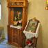 Το εσωτερικό του ναού κοσμείται από ένα ξυλόγλυπτο τέμπλο, όπου δεσπόζει η εικόνα του Αγίου Γεωργίου, έργο του ζωγράφου Ιωάννη Φραγκόπουλου, φιλοτεχνημένη το 1844. Στο ιερό συναντάται μια ακόμη εικόνα του Αγίου, αυτή τη φορά από τον Κωνσταντίνο Σινωπέα, χρονολογημένη το 1871. Η τελευταία ανακαίνιση του ναού πραγματοποιήθηκε το 1954, διατηρώντας την αρχική του μορφή, ενώ προστέθηκε και ένα μικρό, λιτό καμπαναριό, που ολοκληρώνει την εικόνα του ναού.