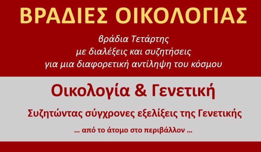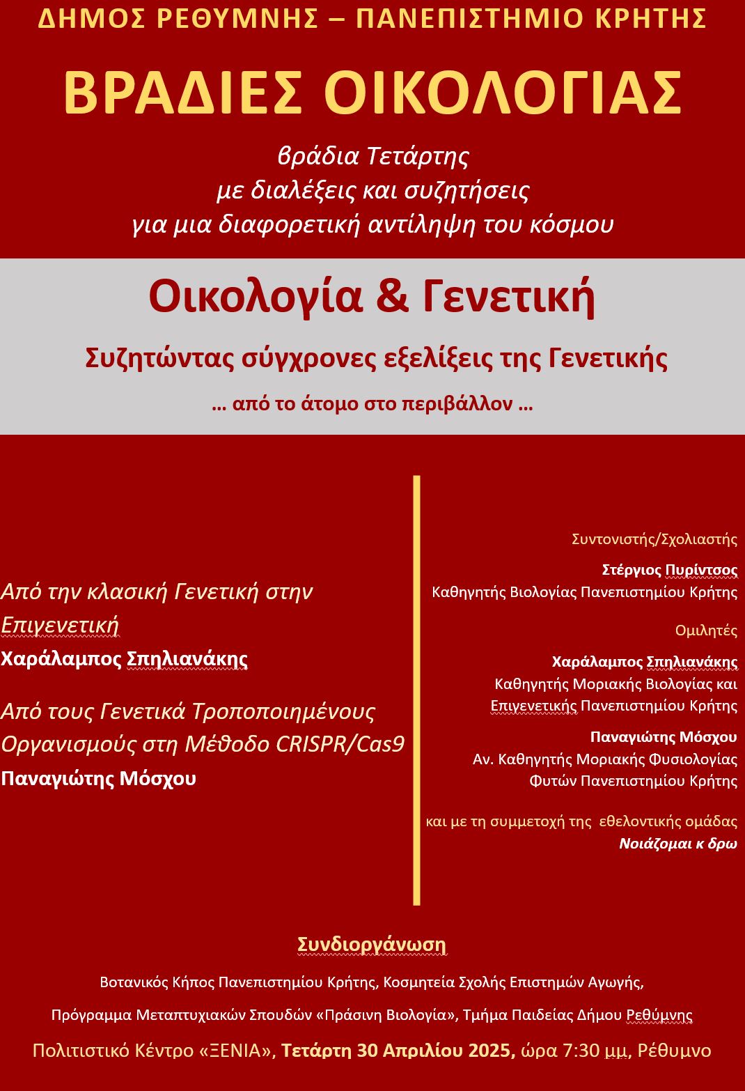 Η «Οικολογία & Γενετική» θα τεθούν στο επίκεντρο των εισηγήσεων και του διαλόγου που θα αναπτυχθεί στις «Βραδιές Οικολογίας» που συνδιοργανώνουν ο Δήμος Ρεθύμνης και το Πανεπιστήμιο Κρήτης, την Τετάρτη 30 Απριλίου 2025, στις 7:30 μμ, Πολιτιστικό Κέντρο «ΞΕΝΙΑ», στο Ρέθυμνο.