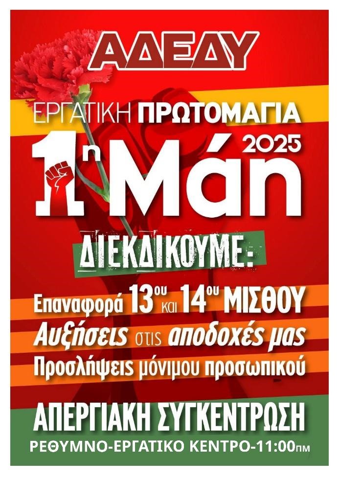 Το Δ.Σ. της ΕΛΜΕ Ρεθύμνου σας καλεί όλους στη συγκέντρωση της Πρωτομαγιάς την Πέμπτη, 1η Μαΐου 2025, στις 11:00 π.μ. στο Εργατικό Κέντρο Ρεθύμνου.