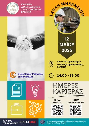 Η Σχολή Μηχανικών και το Γραφείο Διασύνδεσης & Σταδιοδρομίας του Ελληνικού Μεσογειακού Πανεπιστημίου (ΕΛΜΕΠΑ), σε συνεργασία με το Τεχνικό Επιμελητήριο Ελλάδας - Τμήμα Ανατολικής Κρήτης, διοργανώνουν «Ημέρα Καριέρας», τη Δευτέρα 12 Μαΐου 2025, από τις 14:00 έως τις 19:00, στο Κλειστό Γυμναστήριο του ΕΛΜΕΠΑ «Μάρκος Καραναστάσης».