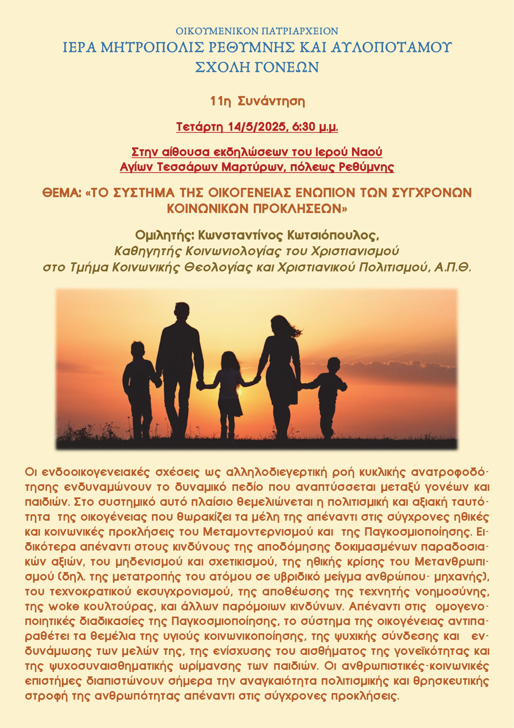 Την προσεχή Τετάρτη 14/5/2025 και ώρα 6:30 μ.μ. θα πραγματοποιηθεί στην αίθουσα εκδηλώσεων του Ιερού Ναού Αγίων Τεσσάρων Μαρτύρων, πόλεως Ρεθύμνης νέα συνάντηση της Σχολής Γονέων της Ι.Μ. Ρεθύμνης και Αυλοποτάμου με θέμα «ΤΟ ΣΥΣΤΗΜΑ ΤΗΣ ΟΙΚΟΓΕΝΕΙΑΣ ΕΝΩΠΙΟΝ ΤΩΝ ΣΥΓΧΡΟΝΩΝ ΚΟΙΝΩΝΙΚΩΝ ΠΡΟΚΛΗΣΕΩΝ»