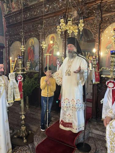 Ο Σεβασμιώτατος, στην προσλαλιά του, αναφέρθηκε στην τόλμη και τη γενναιότητα των Μυροφόρων γυναικών, καθώς και στο πρόσωπο του μακαριστού Μαρίνου Τριπολιτάκη, την καλή του οικογένεια, τη σύζυγο και τα καλά του παιδιά, ευχόμενος πάντοτε ο τόπος μας να πλουτίζεται από ανθρώπους που τιμούν την πρεπειά της Κρήτης.