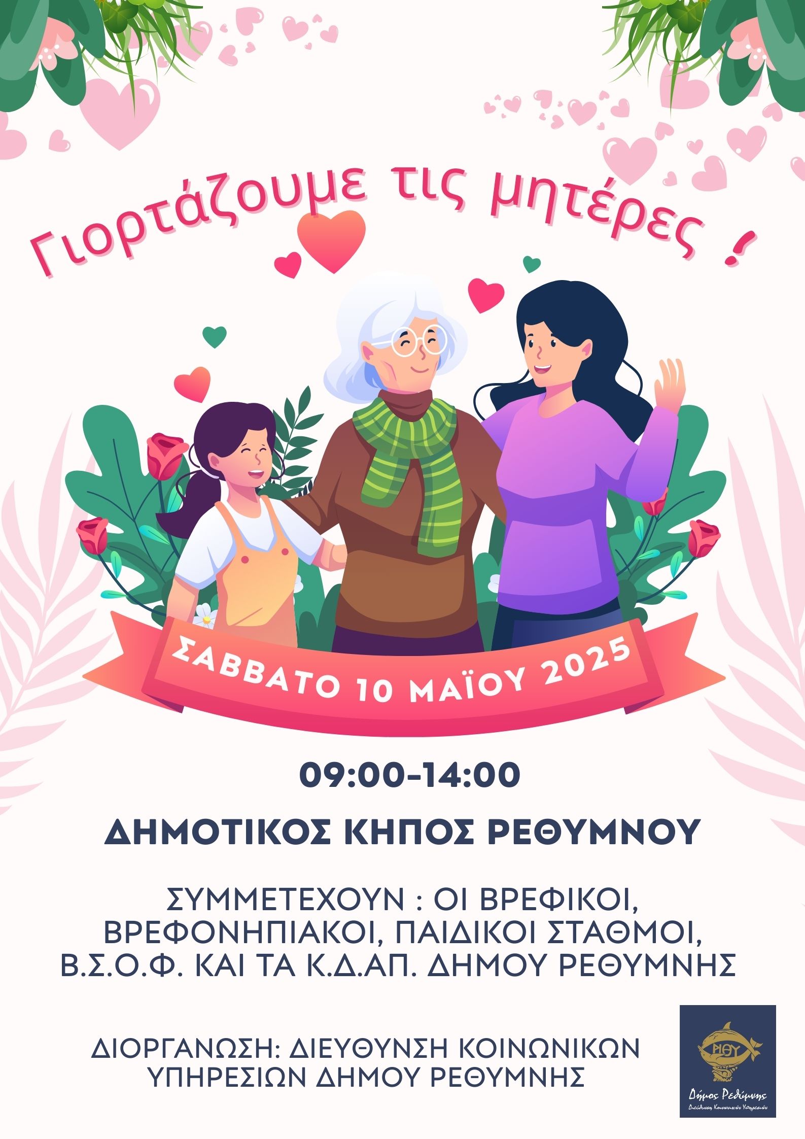 Ο Δήμος Ρεθύμνης, η Κοινωνική Υπηρεσία και η Αντιδήμαρχος Κοινωνικής Πολιτικής, Δρ. Άννα Ελευθεριάδου-Γκίκα, προσκαλούν τα παιδιά και τις οικογένειες της πόλης σε μια γιορτή με δράσεις για μικρούς και μεγάλους. Μια ημέρα αφιερωμένη στη μητρότητα, με χαρούμενες στιγμές, δημιουργία και συμμετοχή από όλους.