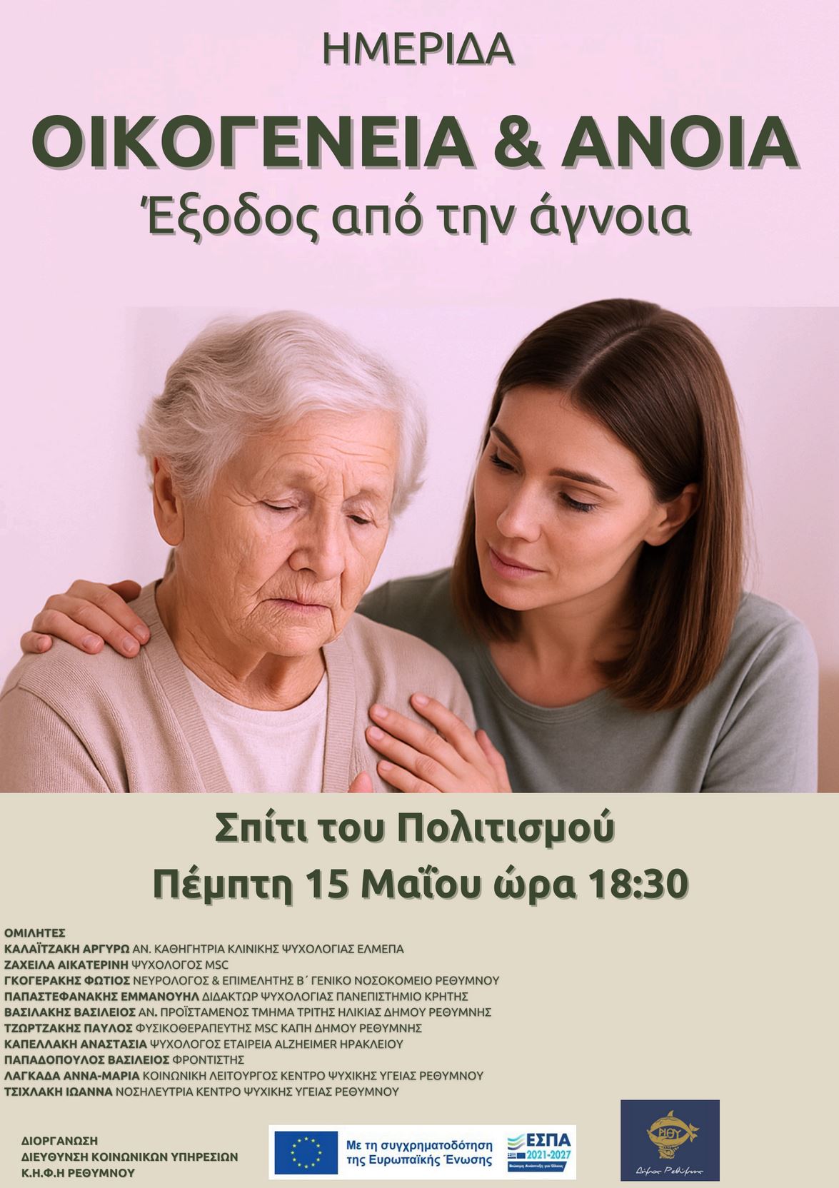 «Οικογένεια & Άνοια – Έξοδος από την άγνοια» που θα πραγματοποιηθεί την Πέμπτη 15 Μαΐου 2025 και ώρα 18:30, στο Σπίτι του Πολιτισμού στο Ρέθυμνο.